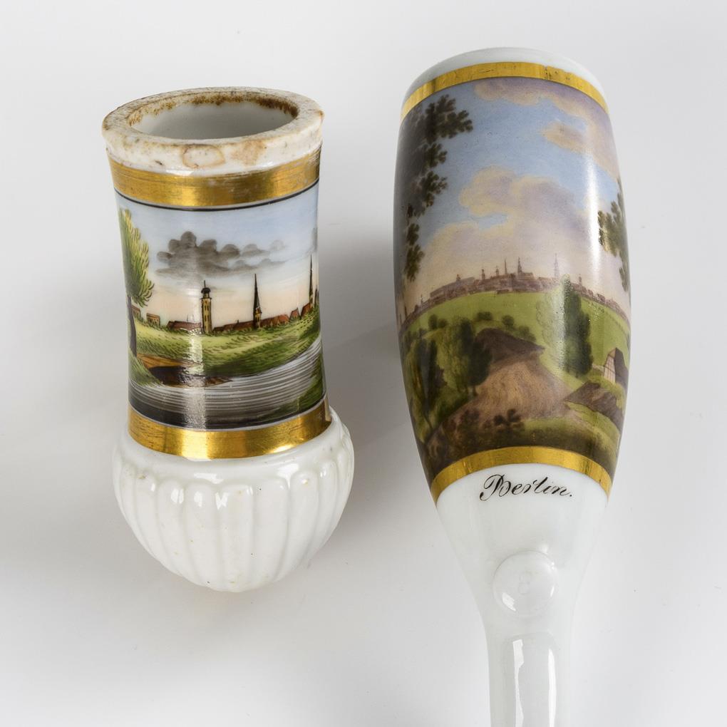 In einer goldgerahmten Rechteckkartusche jeweils eine bezeichnete Ansicht von Berlin bzw. Bremen. 1x mit Silbermontierung. 1x mit Randbestoßungen, partiell minimaler Goldabrieb.
