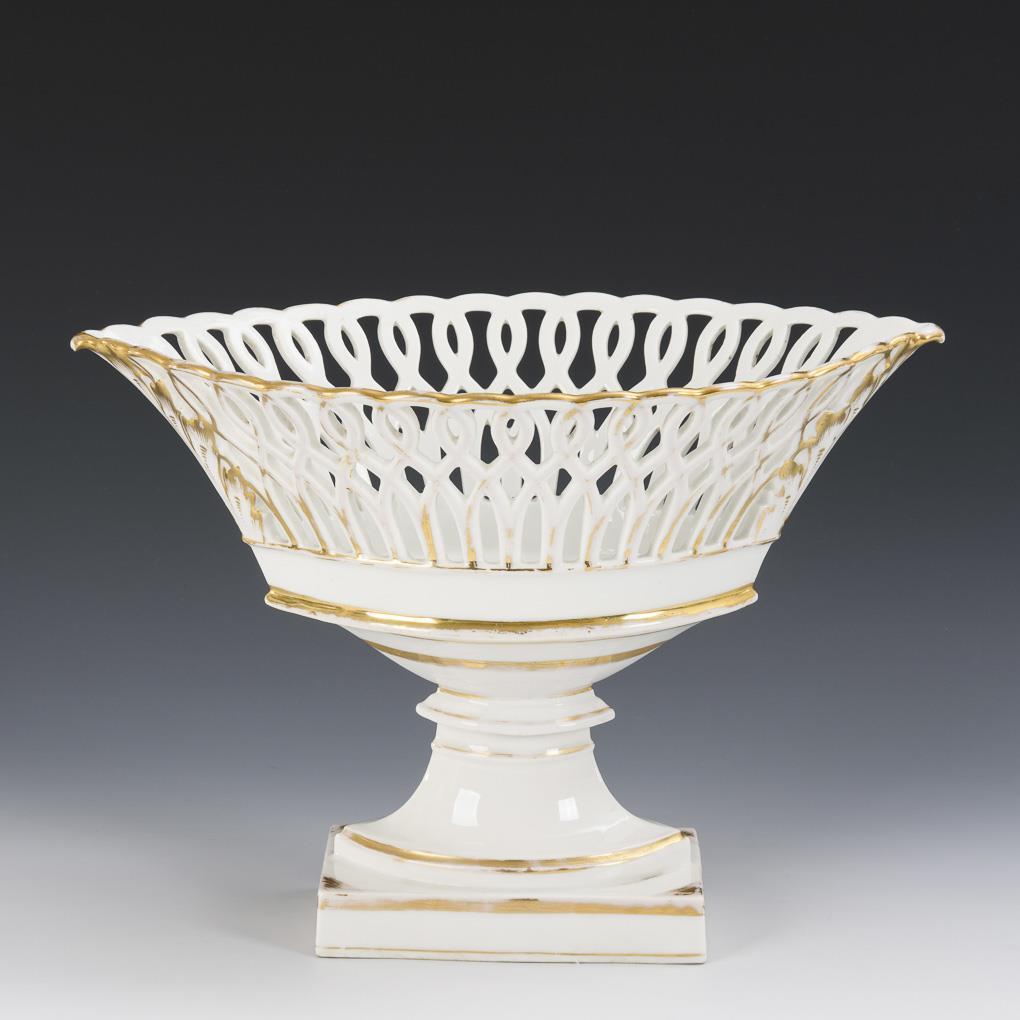 Rautenförmiger Korb mit Blattzier an den Ecken, auf Rechteckplinthe. Gold berieben.