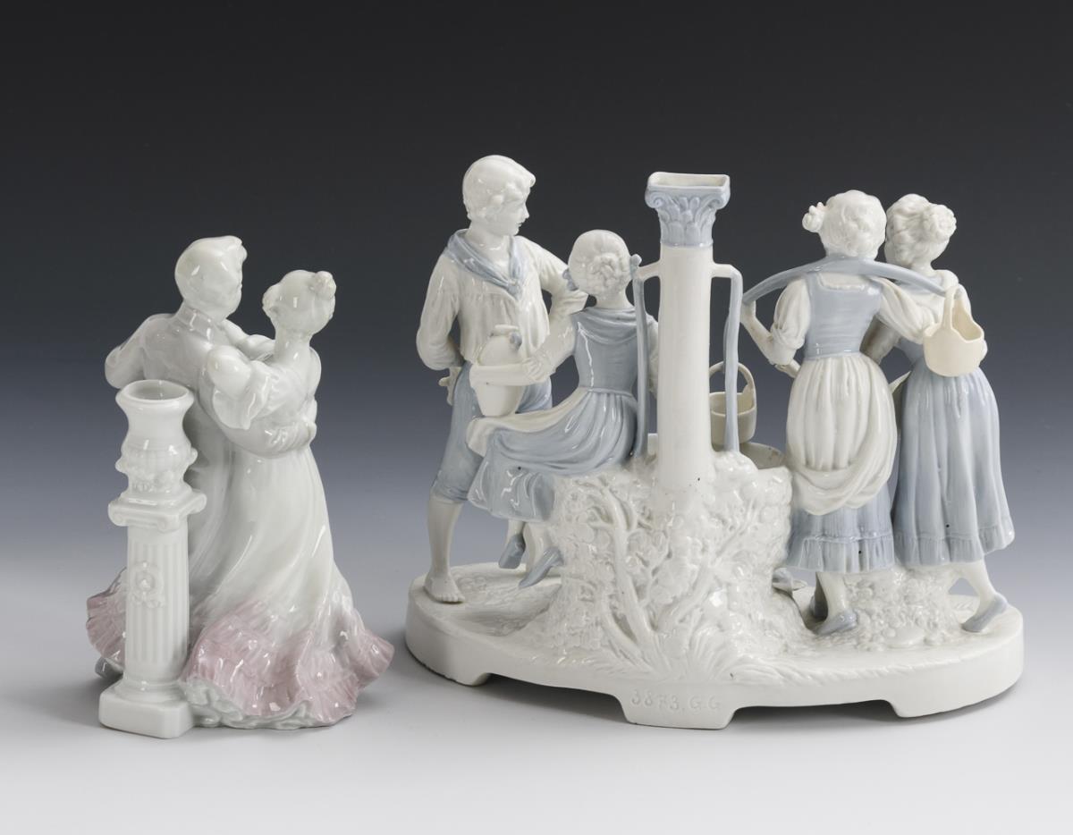 1x Heubach, Sonnenmarke, um 1900: schwungvoll tanzendes Paar (H 17,5 cm). / 1x ungemarkt: 3 junge Frauen und 1 junge Mann an einem Brunnen (H 20,5 cm, L 24 cm). 1 Wassergefäß der Brunnengruppe restauriert.