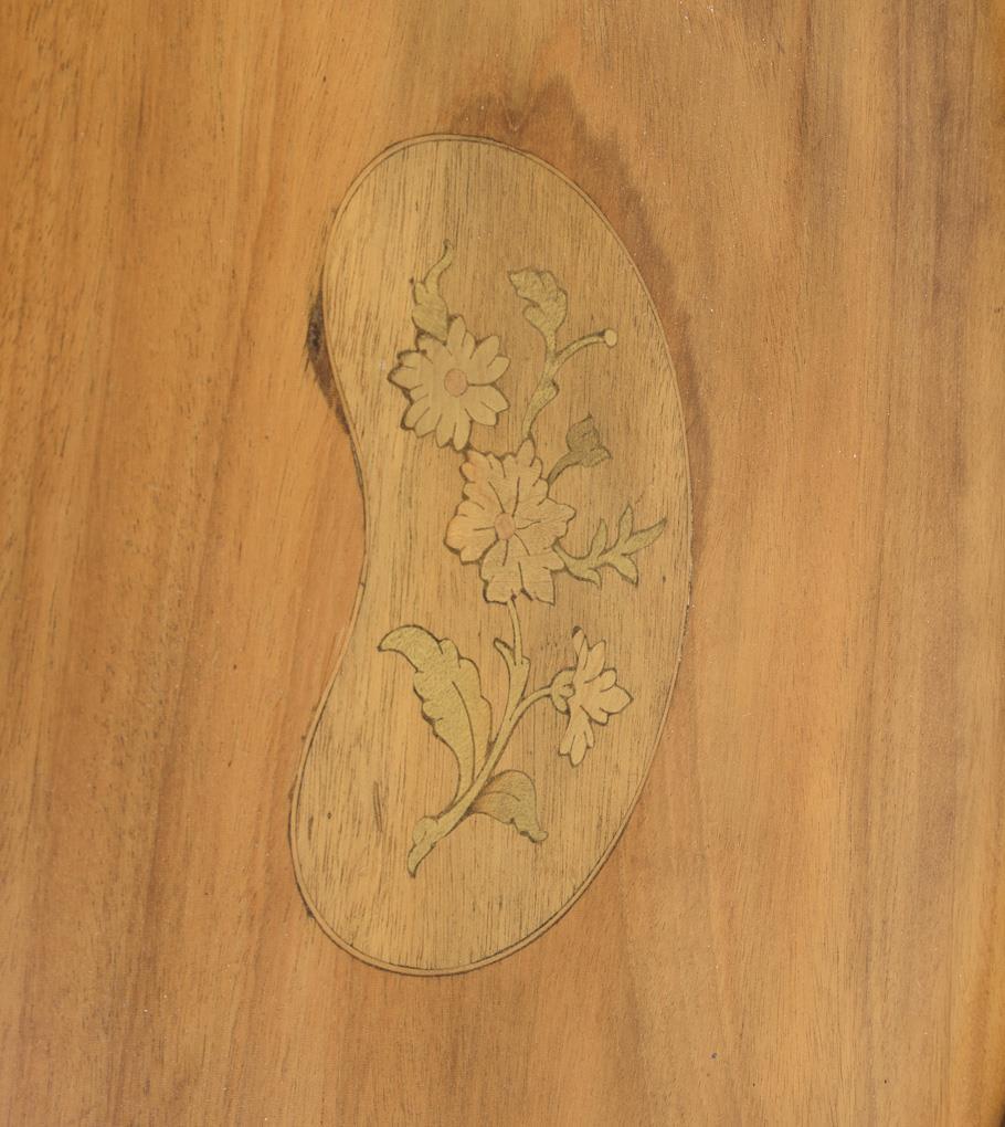 Ovales Tablett mit marketierter Schnecke im Zentrum sowie abwechselnd hell-dunkel furnierter Rand. Ähnlich gestaltetes Tablett in Nierenform mit Blütenzweig im Zentrum und gleichen Griffen am einfarbigen Rand. Wenige Alters-/Gebrauchsspuren.