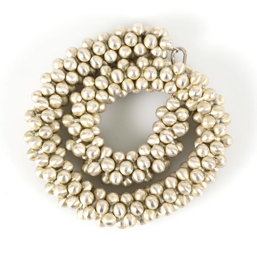 Schnürkette mit satinierten 3er-Kugelgliedern auf Gummiband. S-Hakenverschluss.