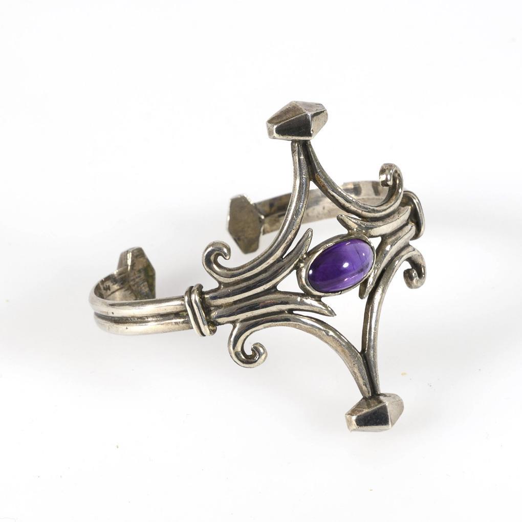 Offener Reif mit zargengefasstem Amethystcabochon.
