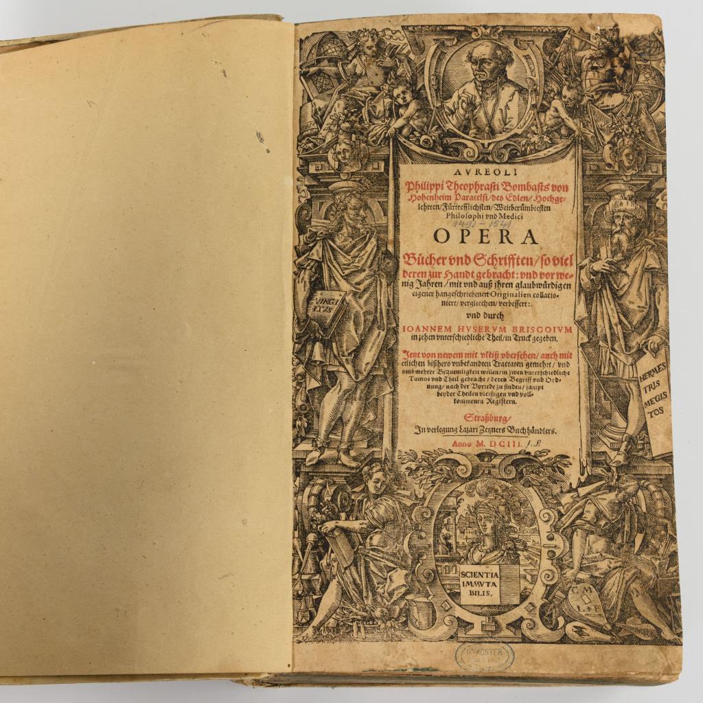 "Aureoli Philippi Theophrasti Bombasts von Hohenheim Paracelsi ... Opera: Bücher und Schrifften, so viel deren zur Handt gebracht: und vor wenig Jahren, mit und auß ihren ... Originalien collacioniert, vergliechen, verbessert, und durch Joannem Huserum Brisgoium in zehen unterschiedliche Theil, in Truck gegeben". Titelseite mit Holzschnittrahmen, Widmungsseite an Ernst (Erzbischof zu Köln) , (10), 1127, (53) / Titelblatt "Ander They ... Darinnen die Magischen und Astrologischen Bücher, sampt ihren Anhängen und Stücken, auch von dem Philosophischen Stein handlende Tractatus, begriffen, &c. Fornen mit einem kurtzen Begriff und Ordnung dieses Theyls Bücher, und derselben Innhalt: Hinden aber mit einem durchauß vollkommenen Register vermehret ", (6), 691, (12) Seiten. Pergamenteinband. Nach der ersten Textseite vorderes Gelenk teils gerissen, aber altersgemäß guter Zustand,.