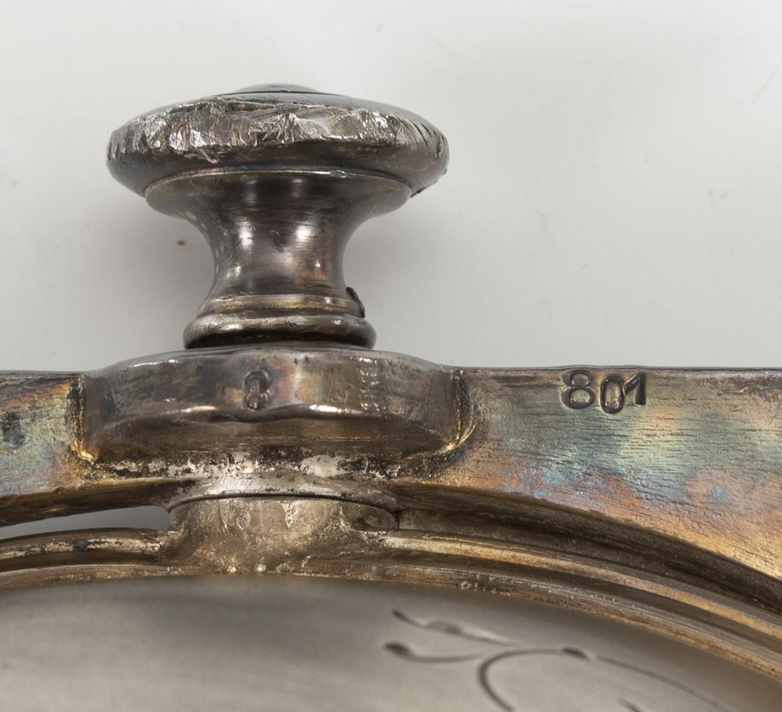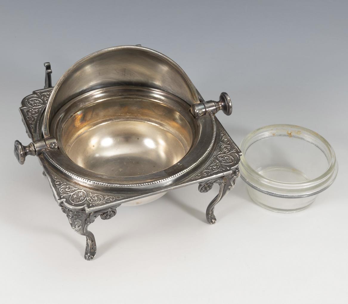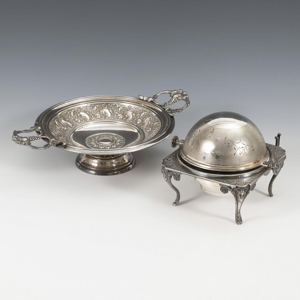 Runde Fußschale mit Rocaillenreliefs und Weinlaubhenkeln. H 8,5 cm, Ø 23 cm. Quadratisches Kaviargefäß mit versenkbarer Haube und Löffelhalterung. H 14 cm. Leichte Alters- und Gebrauchsspuren, Glaseinsatz ergänzt.