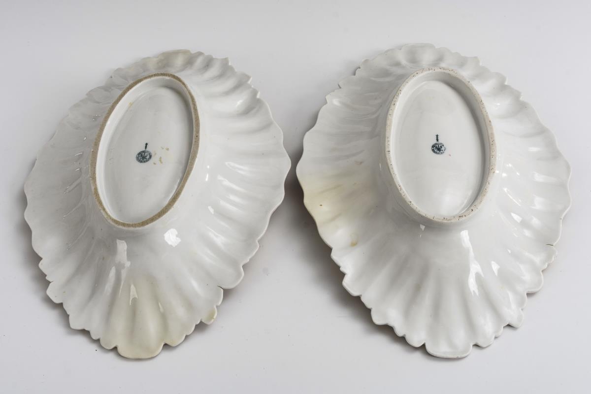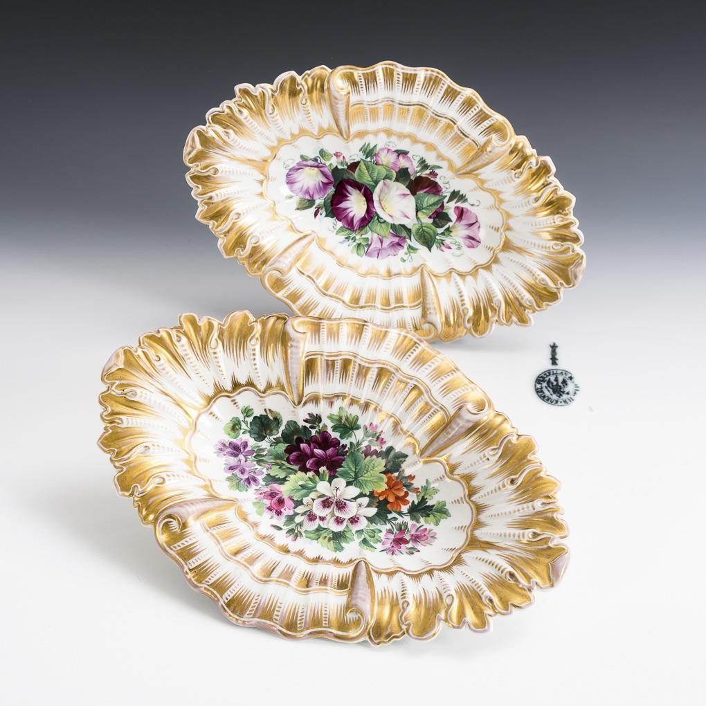 Ovale Schalen mit blatt- und muschelreliefierter Fahne, im Spiegel jeweils ein großes Blumenbukett, 1x mit Geranien und 1x mit Trichterwinden. Partiell wenig Goldabrieb, beide mit Randrestaurierung.