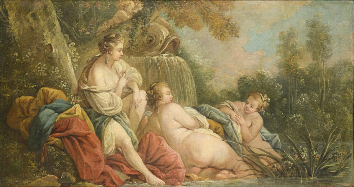 Im Stil des Rokoko gemalte drei Frauen im Sonnenschein am Ufer eines Gewässers. Leichte Altersspuren.