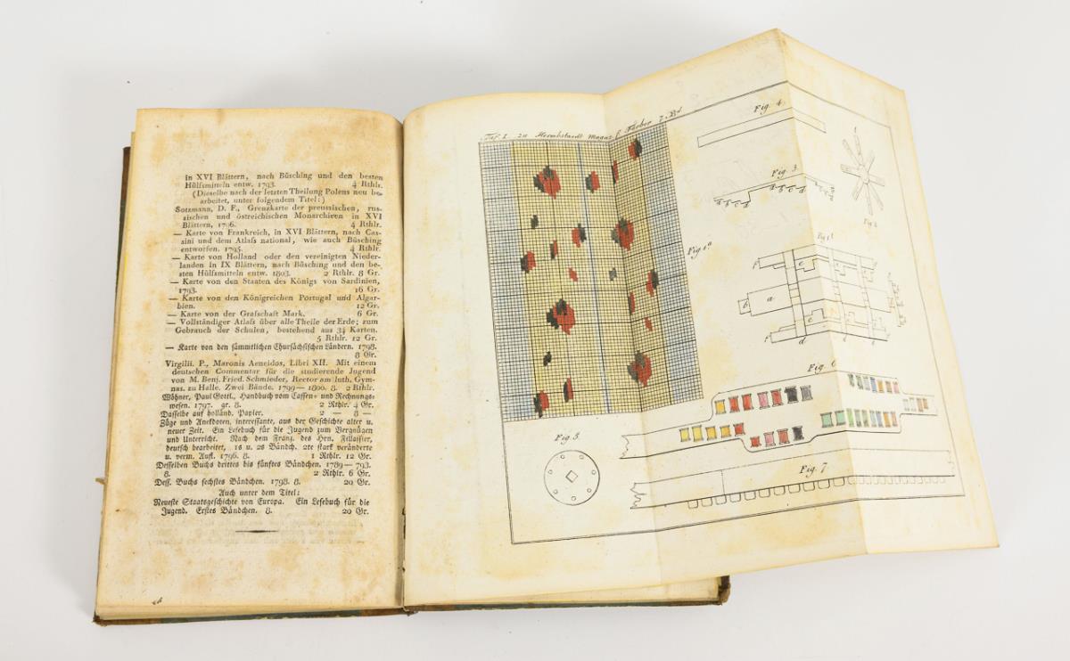 Vollständig mit den angegebenen Kupfertafeln und handkolorierten Farbkarten. Zwei Kupferstiche aus Band drei gehören in Band vier. Halbledereinband. Leichte Altersspuren, Einband und Rückenschilder berieben, schwach stockfleckig.