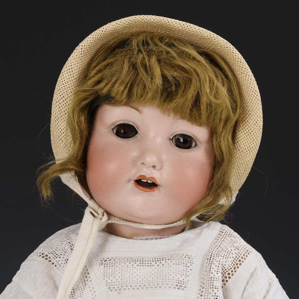 Kurbelkopf, braune Glasaugen (ehemals Schlafaugen), Wimpern, blonde Mohairperücke. 5-teiliger Sitzbabykörper. Weißes Kleid mit Lochstickerei, Schutenhut aus Stroh. Kopf mit Perückenpull, 1 winziger Brandriss an der Halskurbel. Übermalter Körper mit verstummter Stimme, 4 Finger bestoßen.