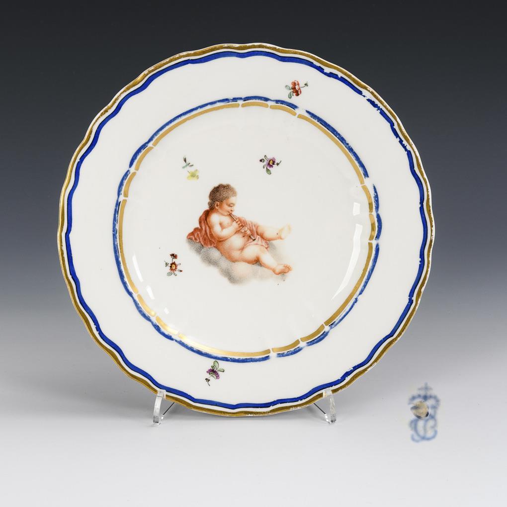 Speiseteller mit passigem Rand, im Spiegel die Darstellung eines auf einer Wolke sitzenden, von Streublümchen umgebenen Putto mit Flöte. Partiell berieben.