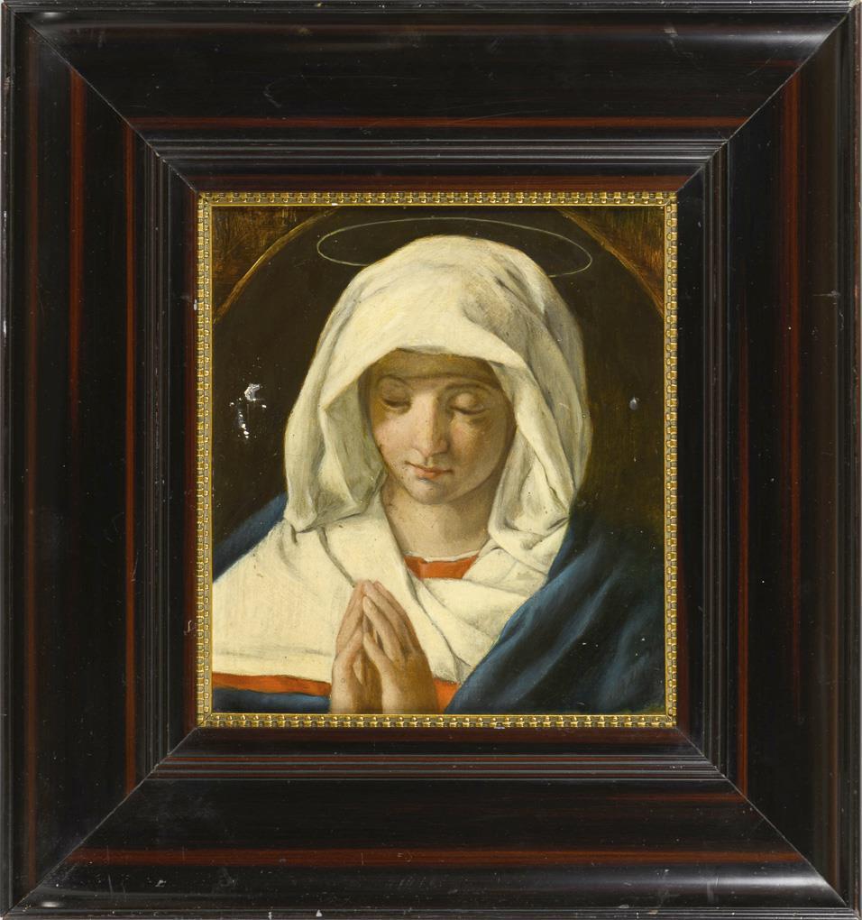 Maria mit gesenktem Blick, Heiligenschein und zum Gebet gefalteten Händen. Farbabsplitterungen.