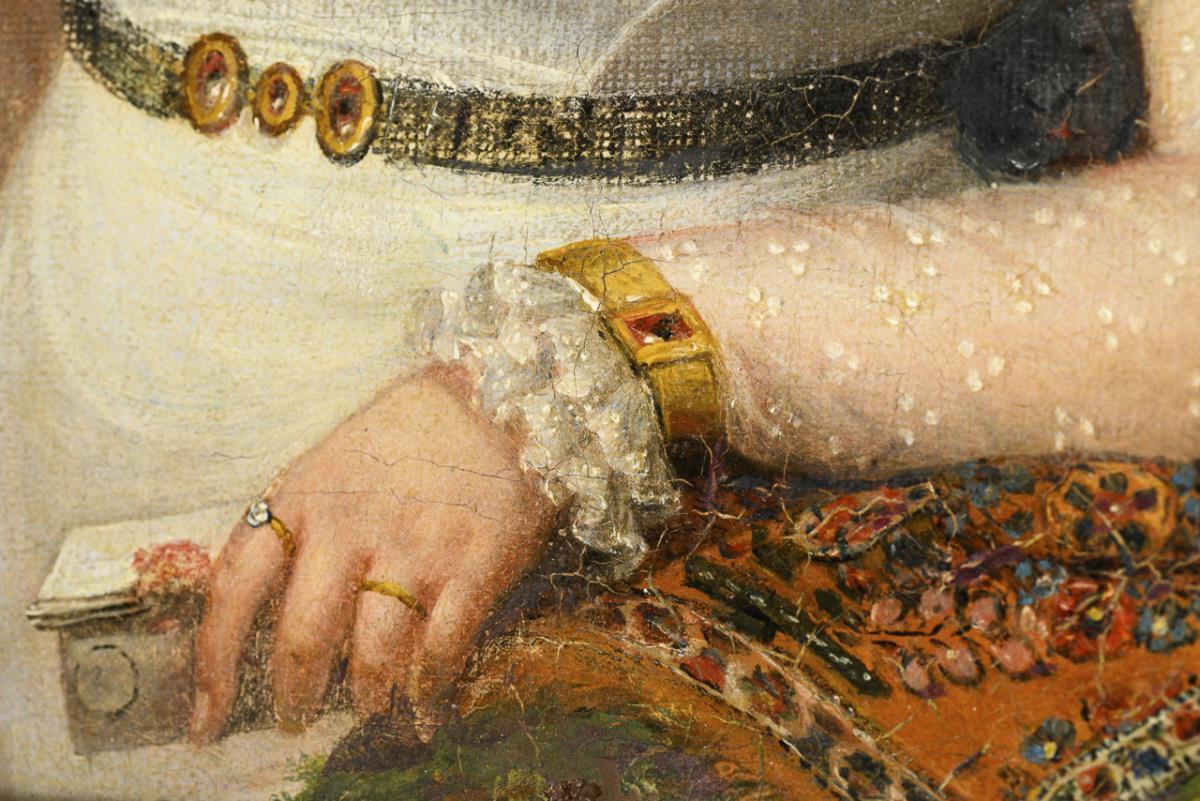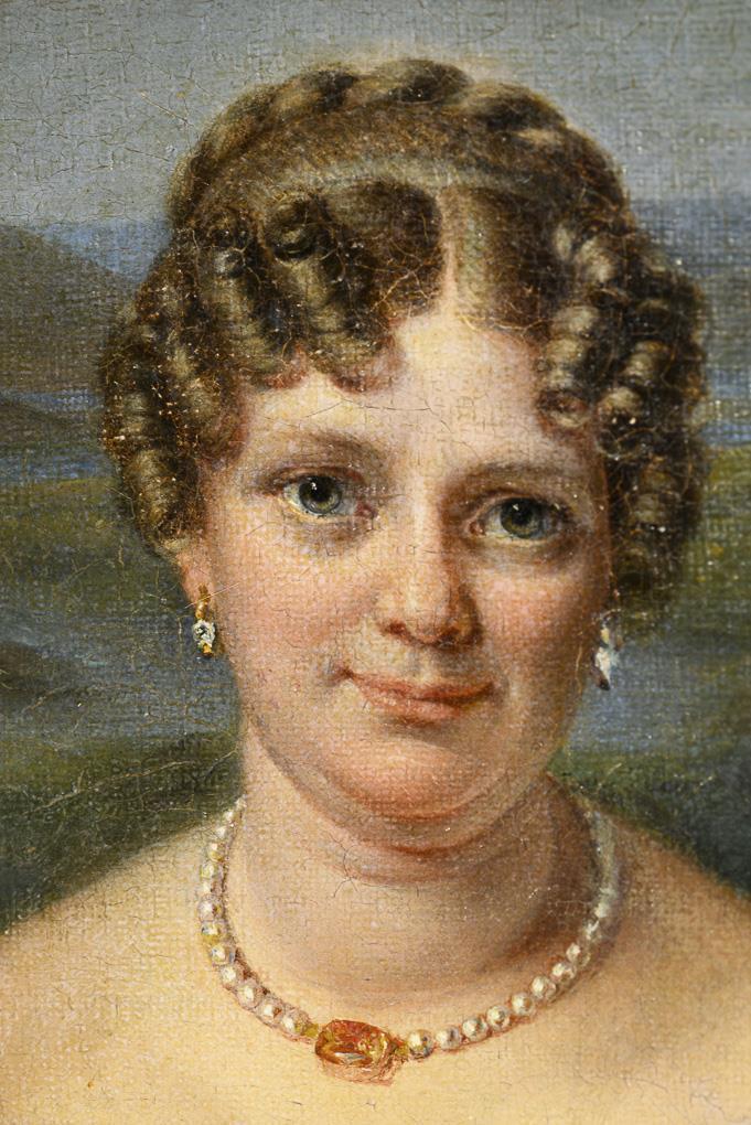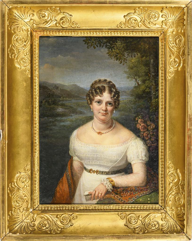 Porträt einer jungen Frau im schönen Kleid mit Gold- und Perlenschmuck vor weiter Flusslandschaft. Eine kleine restaurierte Stelle mit Hinterklebung.