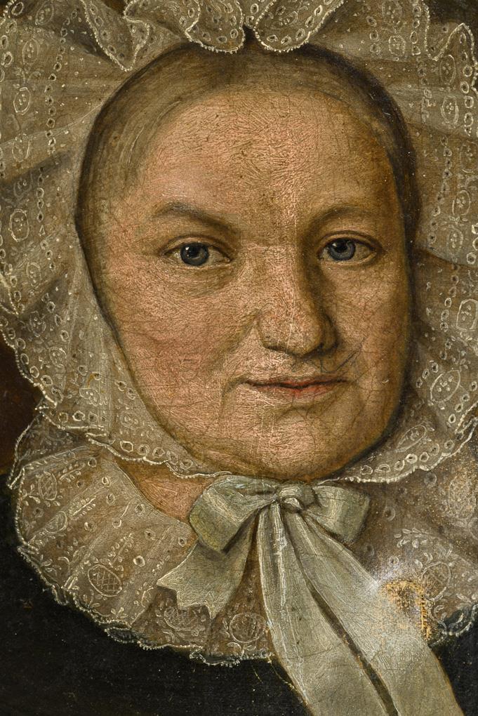 Porträt einer älteren Frau im schwarzen Kleid mit Spitzenhaube. Eine verklebte Stelle.