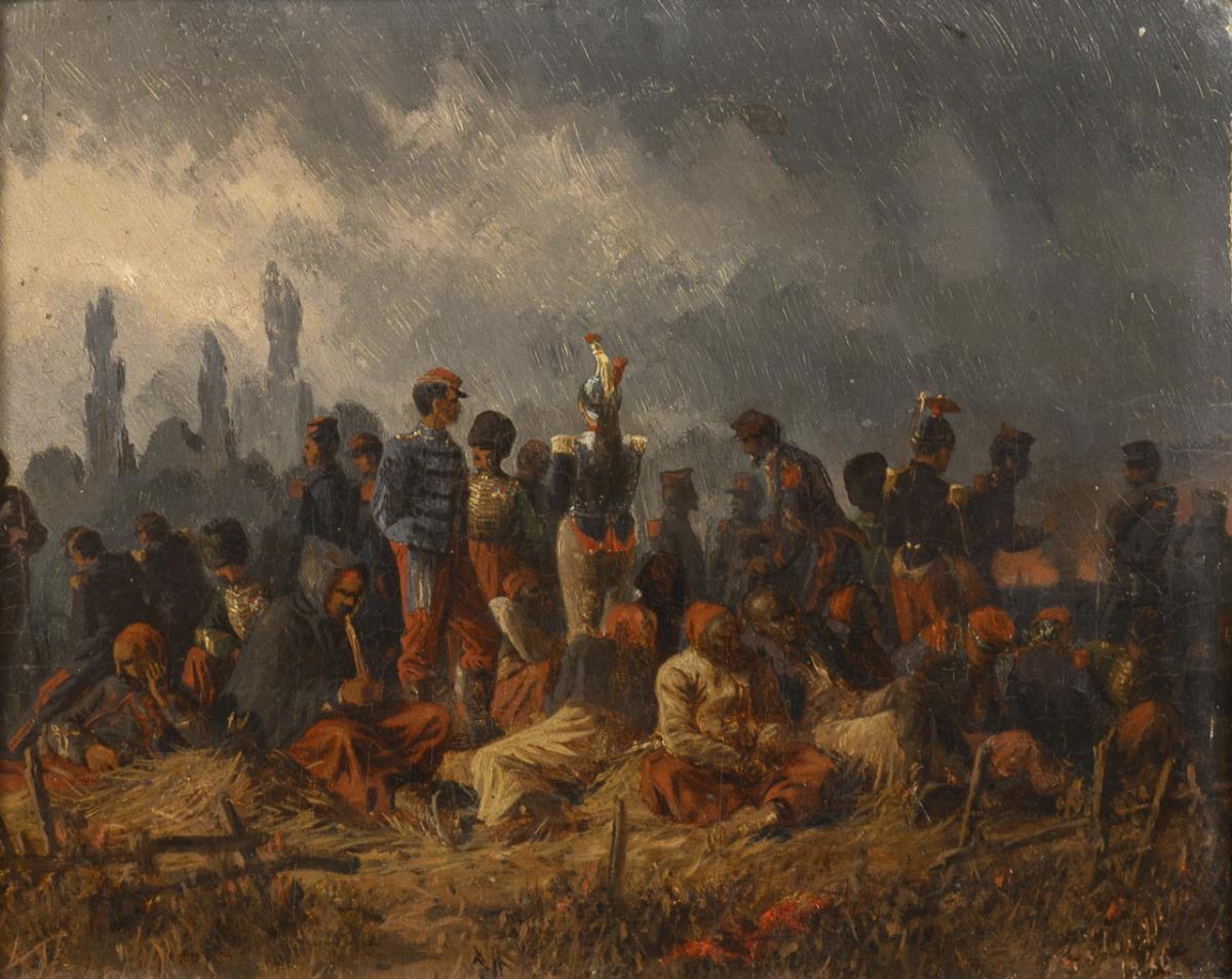 Die französischen Soldaten auf dem Feld in Gesprächen unter dunkel bewölktem Himmel. Minimale Altersspuren.