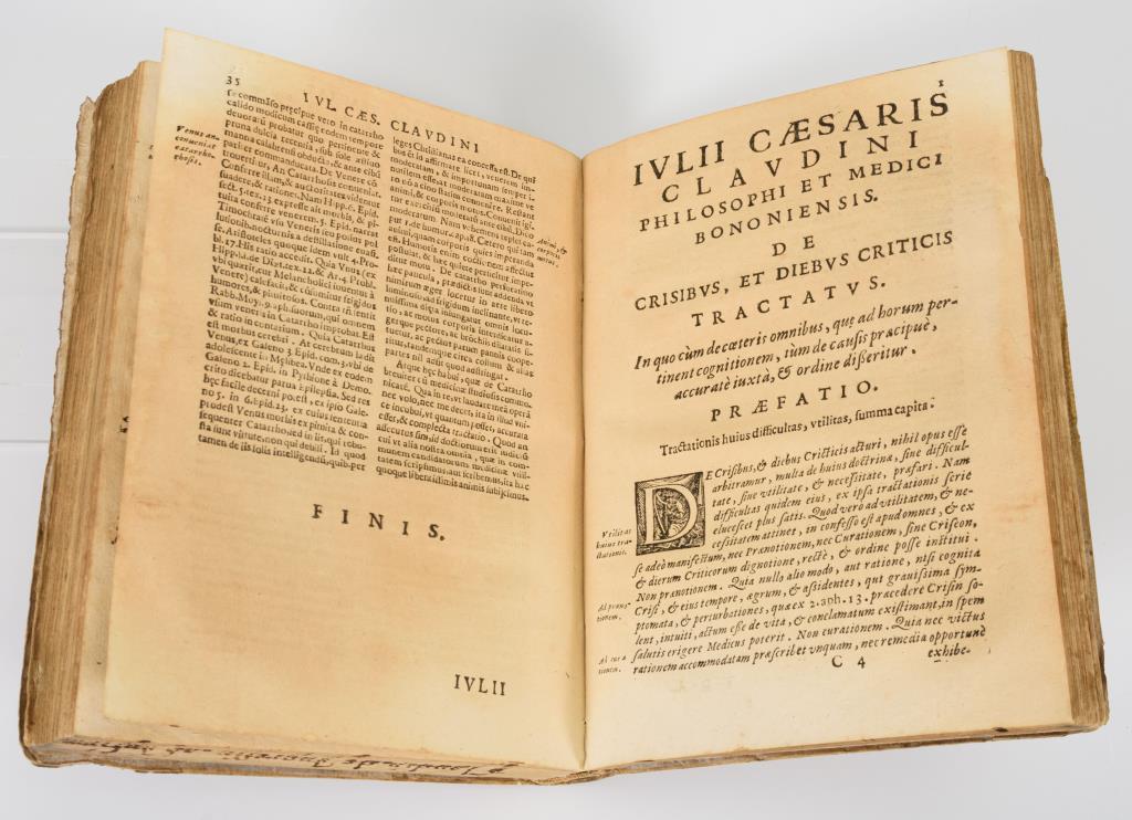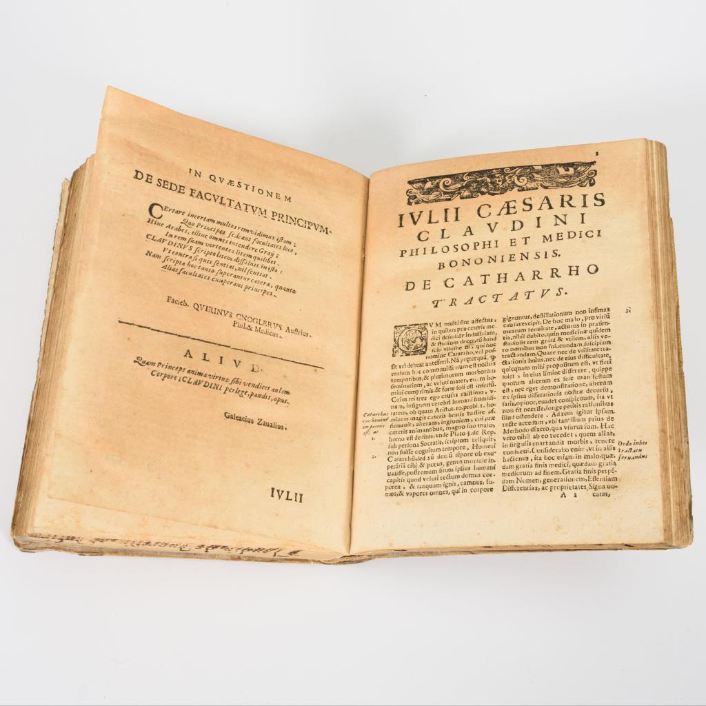 "Julii Cæsaris Claudini ... De ingressu ad infirmos libri duo. In quibus medici omnes, ex tempore medicinam facturi, manus, sive per se curet, sive cum aliis de curando consultet, accuratissimè, tanquam in tabula, delineatum continetur. Cum appendice de remediis generosioribus et questione Philosophico, medica de Sede Principuum Facultatum". Titelblatt, (26), 225, 35, 62 Seiten. Pergamentbroschureinband mit Fraß- und Altersspuren, Block aber gut erhalten. Titelbezeichnung auf Buchrücken und unterem Schnitt.
