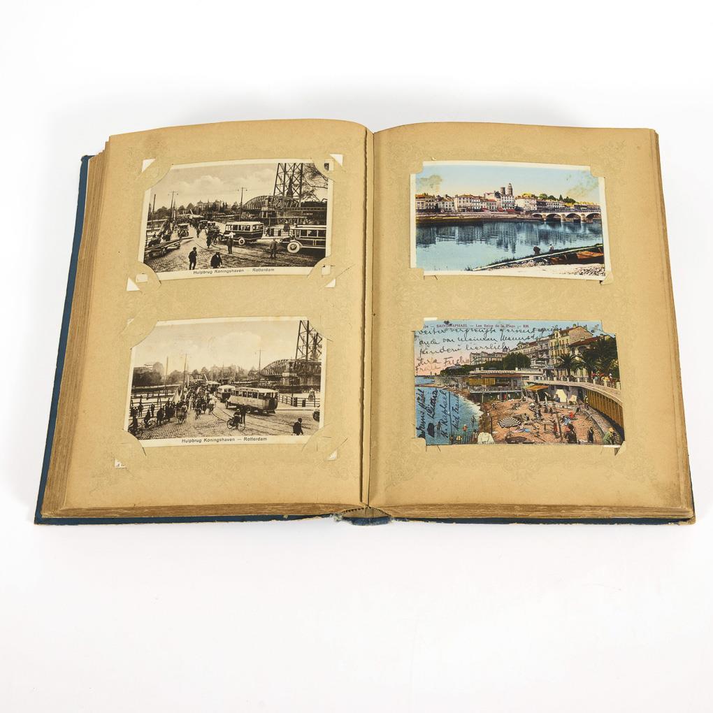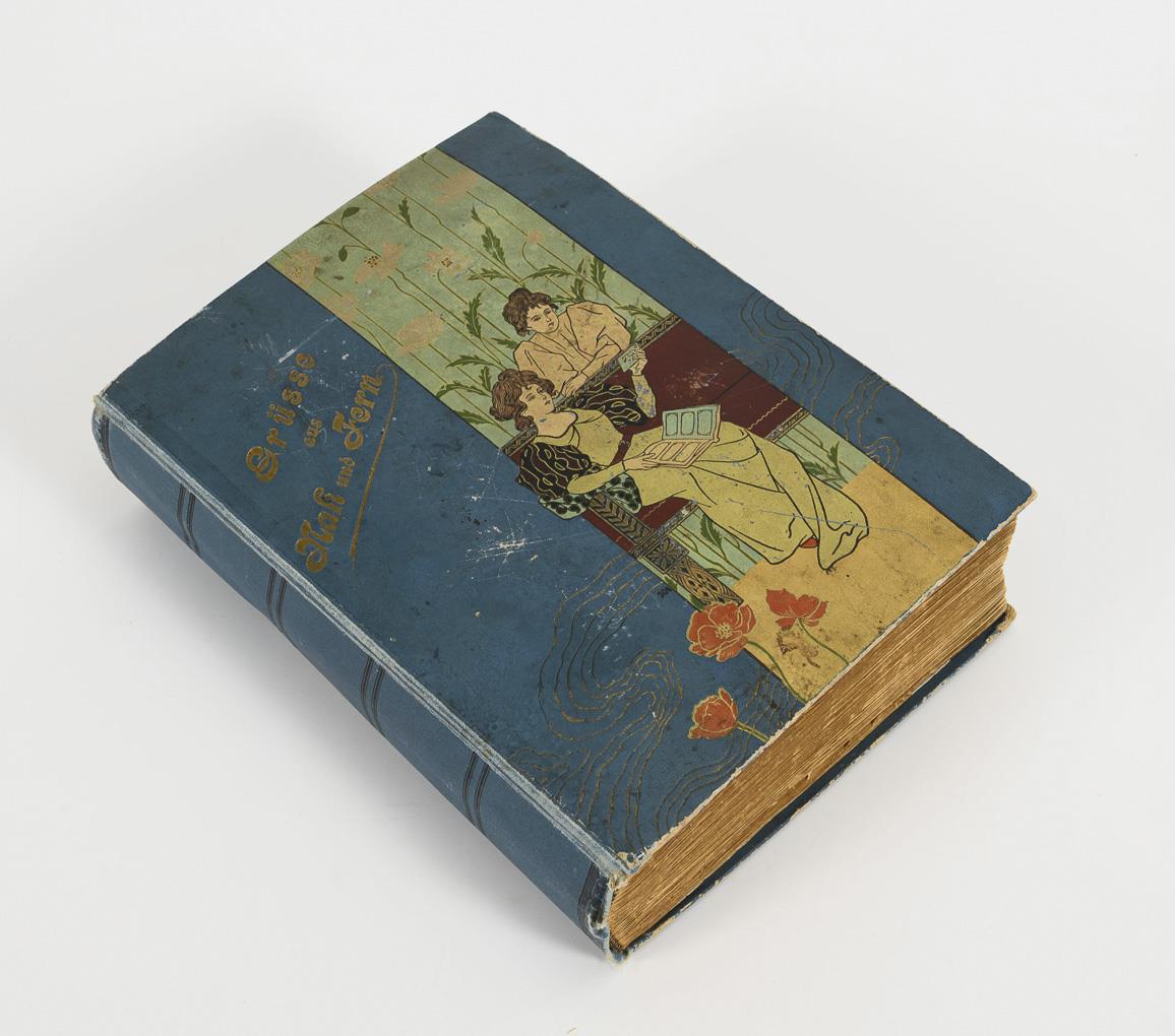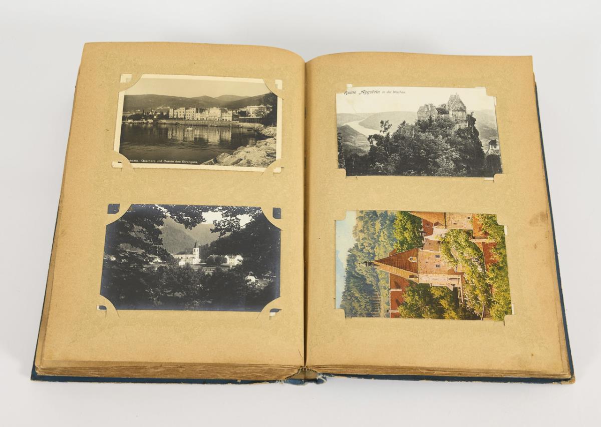 Karten mit Ansichten aus Europa vor 1945. Im blauen Album "Grüsse aus Nah und Fern" mit zwei Jugendstil-Damen.