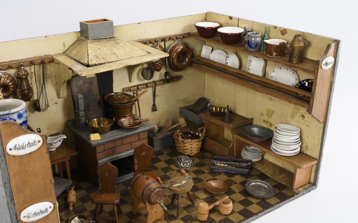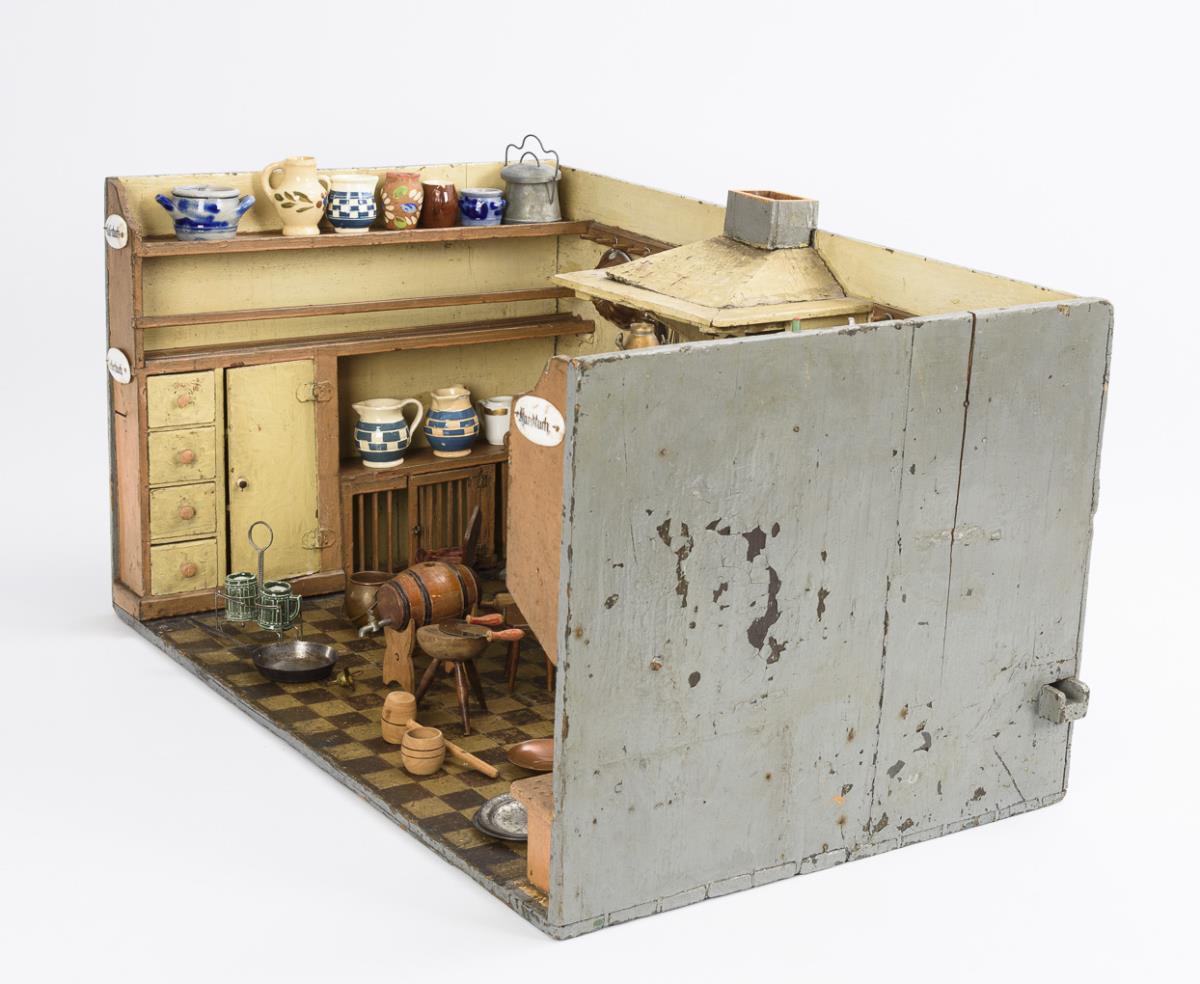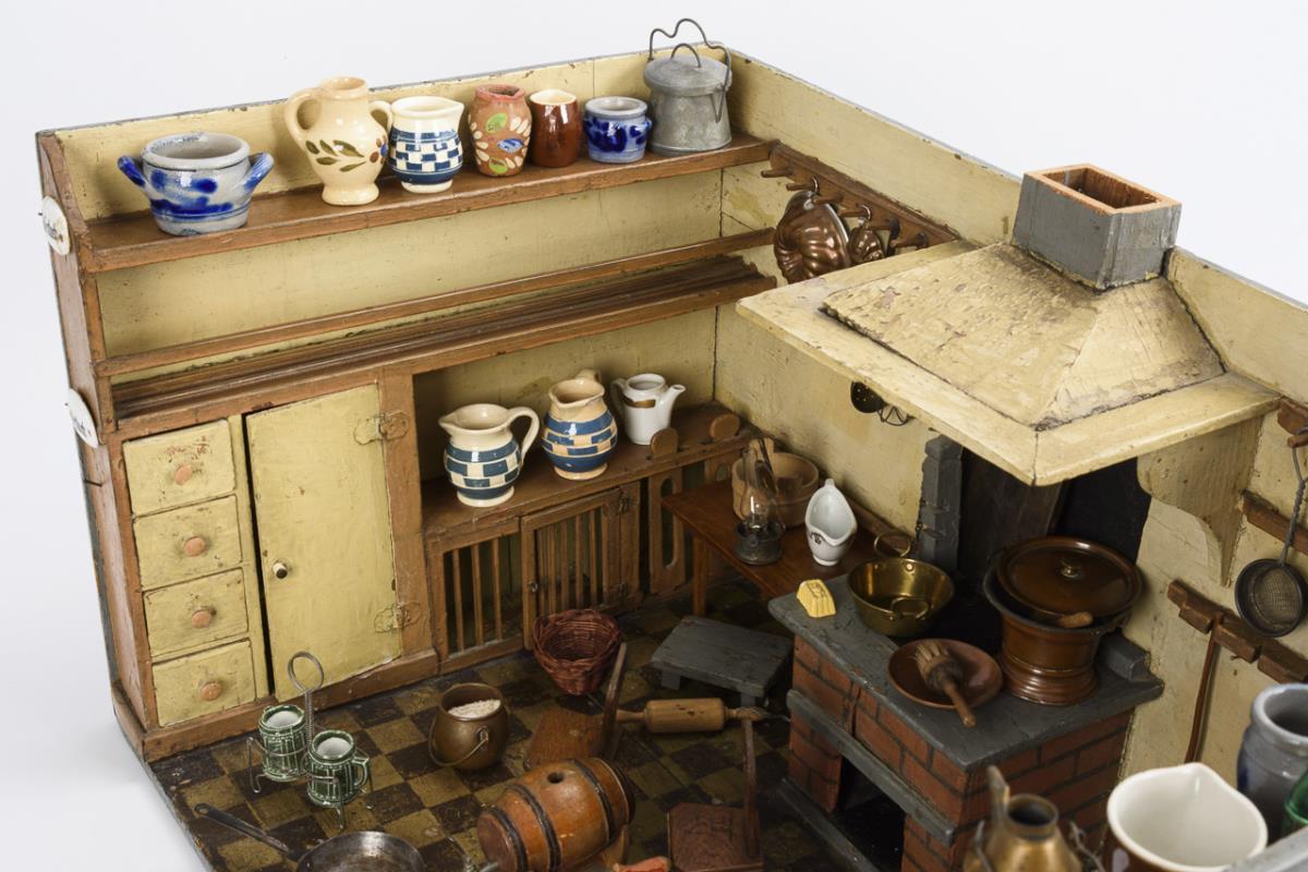 Alte 1-Raum-Puppenküche mit offenem Herdfeuer, Rauchfang, Ausguss und fest eingebauten Schränken mit Hühnerverschlag. Eingerichtet mit einigen bäuerlichen Möbeln, Kupfergeschirr, Keramik und Porzellan. Starke Altersspuren, Trockenrisse im Gehäuse.