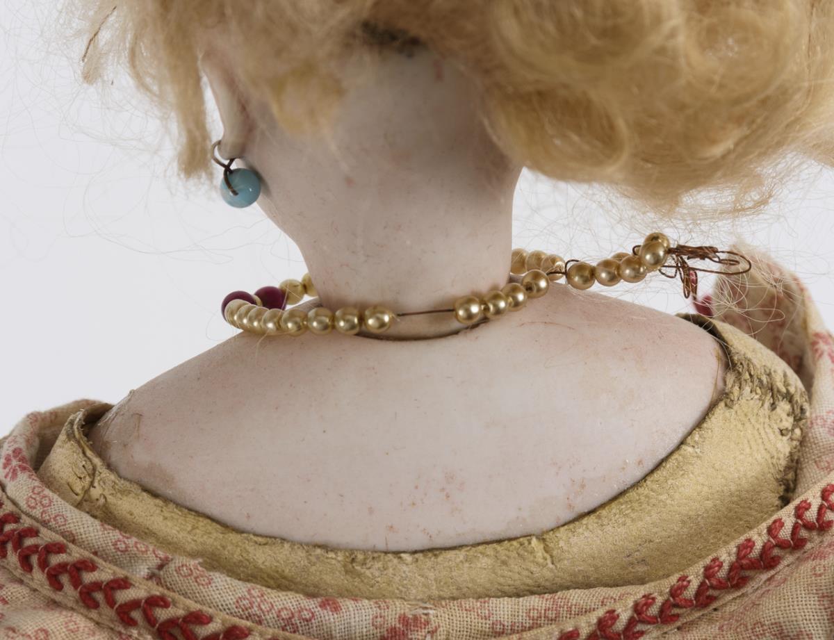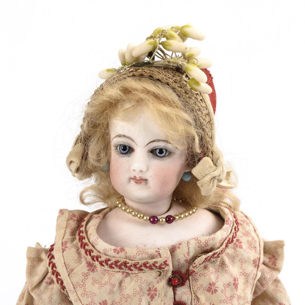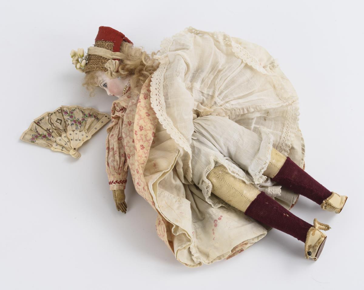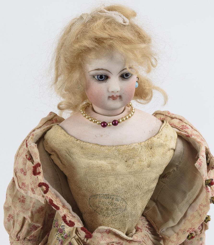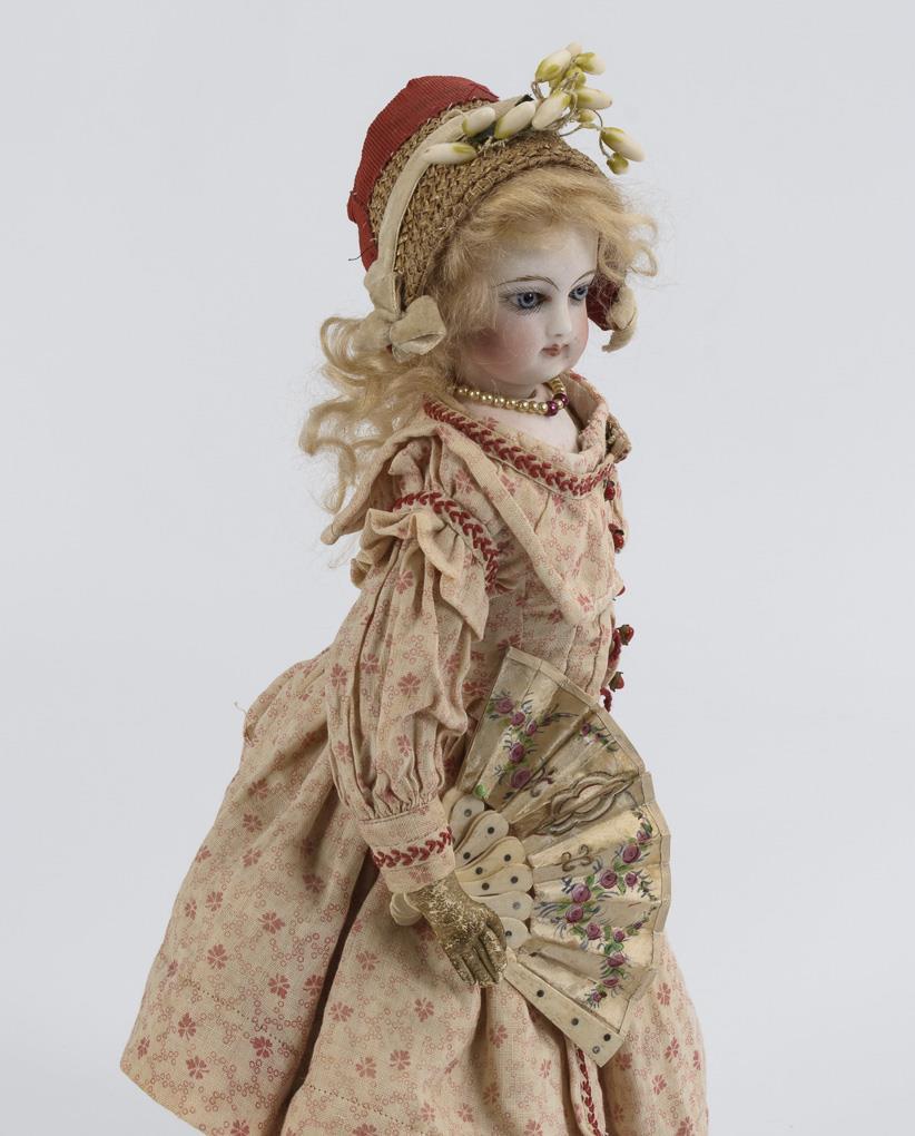 Kurbelkopf auf Brustplatte, feste blaue Glasaugen, Ohrringe, blonde Mohairperücke. Weißer Lederkörper mit genähten Händen. Rosa geblümtes altes Kleid, Strohschutenhut, weinrote Strümpfe und Schuhe, dazu Fächer. Winziger Chip am linken Auge.