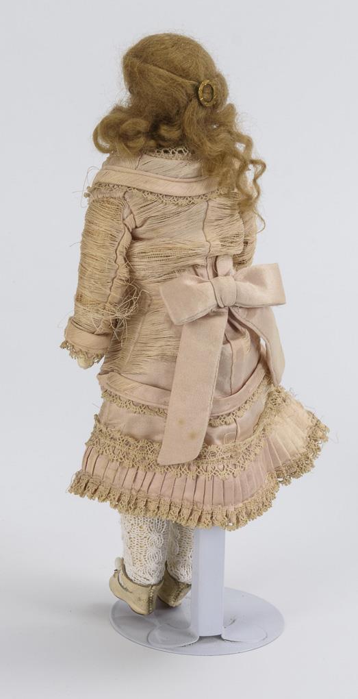 Kurbelkopf auf Brustplatte, feste blaue Glasaugen, Ohrringe, blonde Mohairperücke. Schlanker Lederkörper. Zerschlissenes helles Kleid, alte weiße Lederschuhe, dazu kleiner Fächer. Kopf durchleuchtet: ohne Defekte, lediglich winziger Chip am rechten Ohrloch.