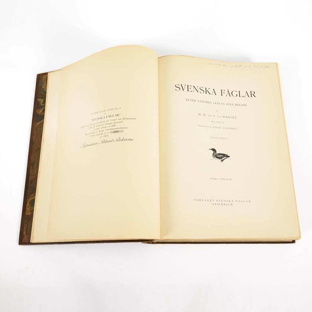 Nummerierte Auflage, Nr. 199. Erster Band von drei. Mit Steinzeichnungen von M., W. und F. von Wright und Texte von Einar Lönnberg, im Ledereinband. 295 Textseiten, teils mit fotografischen Abbildungen und 74 ganzseitige Farblithografien. Einige wenige Abbildungen fehlen, dadurch wenige Textseiten locker.