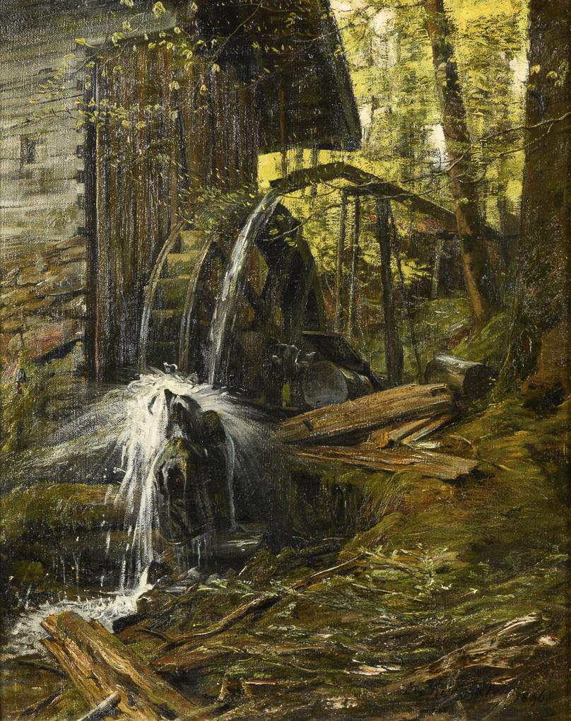Wassermühle am Waldhang zwischen schlanken Bäumen. Minimale Altersspuren.