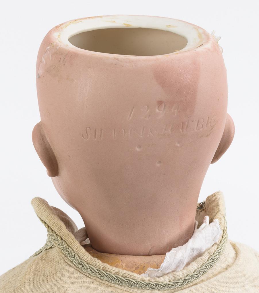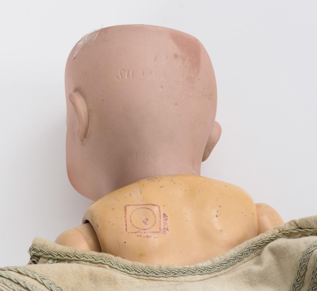 Kurbelkopf, blaue Schlafaugen, mittelblonde Echthaarperücke. 17-teiliger Toddlerkörper mit undeutlichem roten Stempel. Heller Leinenanzug, braune Schuhe. Kurzer, kaum sichtbarer Haarriss am Kopffalz.