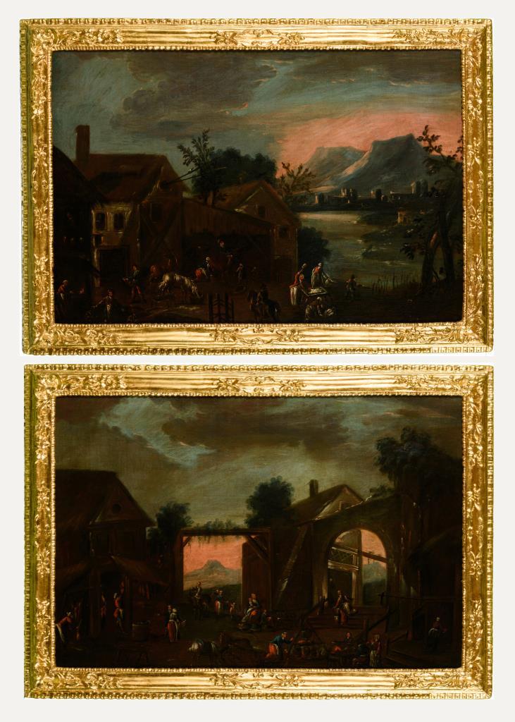 Je Darstellung von Bauernvolk in alltäglichen Szenen des Dorflebens. Je Leinwand doubliert.