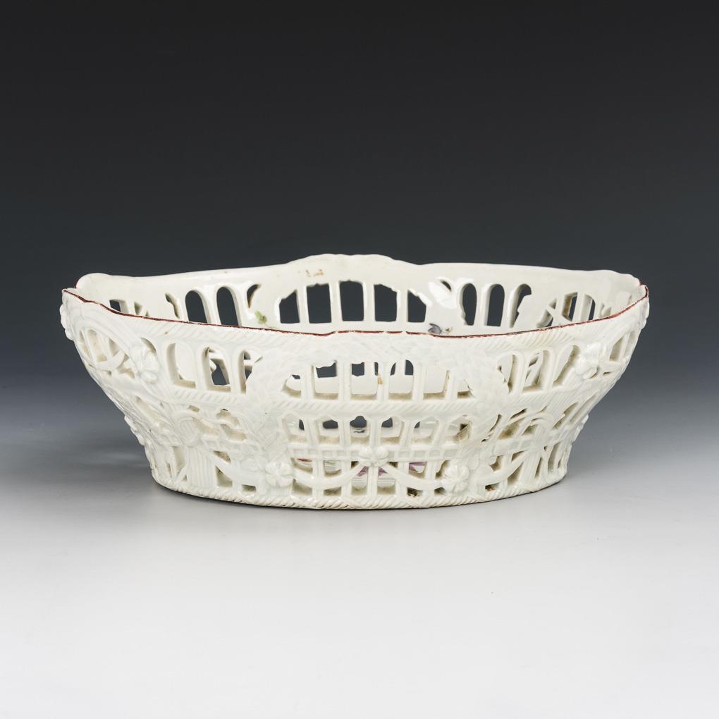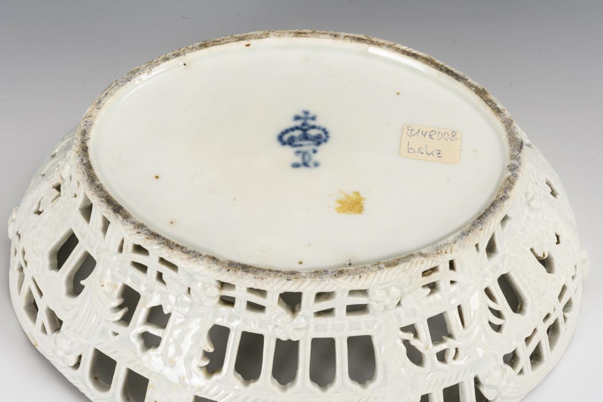 Ovaler Korb mit Bogen- und Stabdurchbrüchen, Girlanden und Blütenrelief. Im Spiegel ein Blumenbukett, umgeben von Streublümchen. 1 Randhaarriss, Bestoßung an 1 Girlande, minimal berieben.