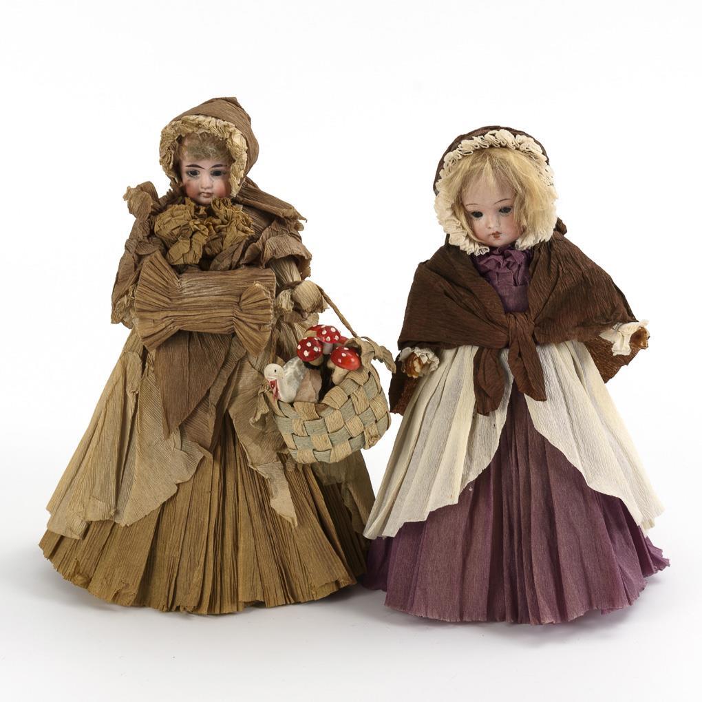 Beide mit Kurbelkopf, Glasaugen, Mohairhaaren und gefältelter Krepp-Papierkleidung. 1x mit alten Masse-Unterschenkeln und modellierten Stiefeln, die andere als Candybox. Kleidung und 1x Hände mit kleinen Defekten.