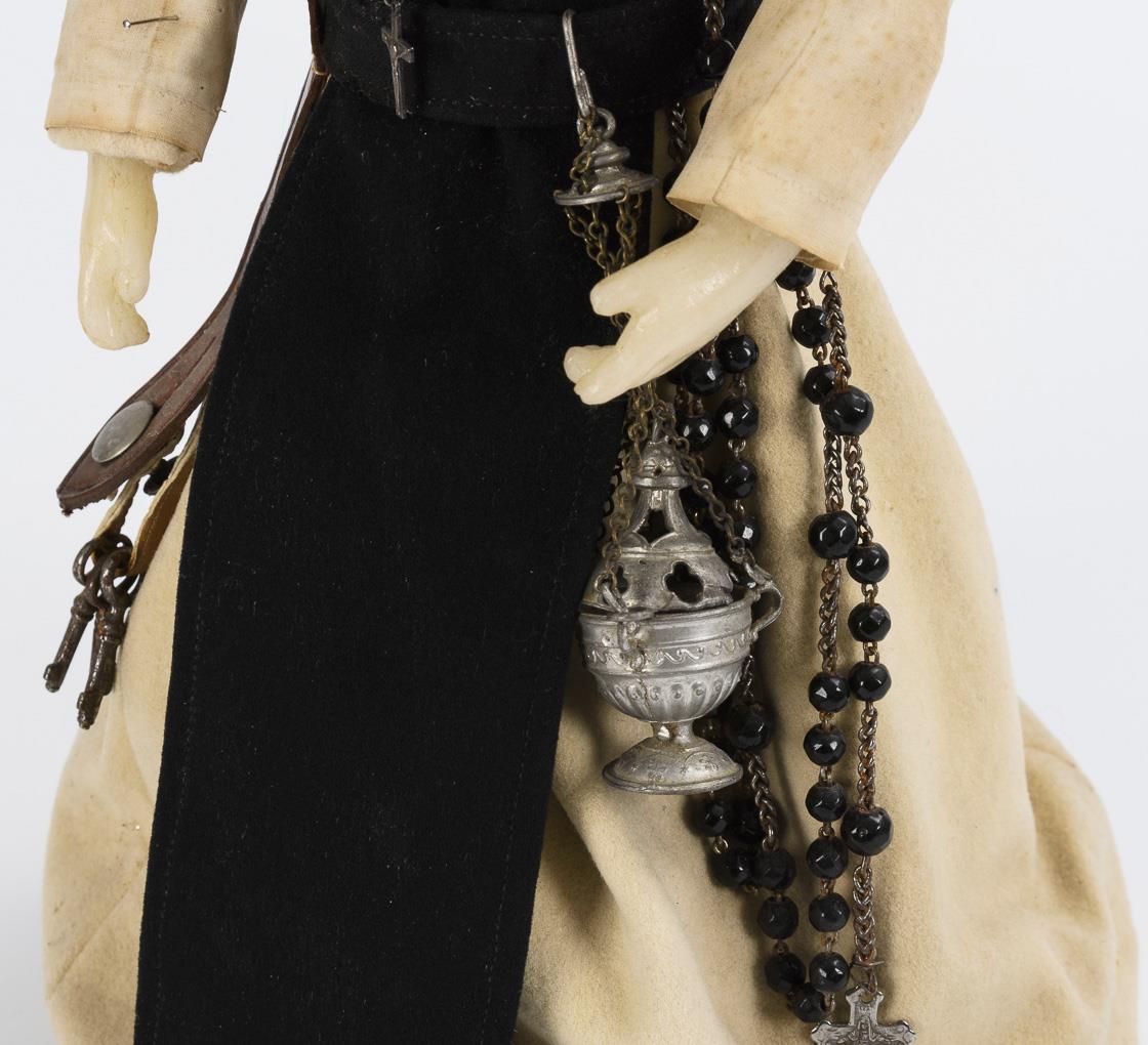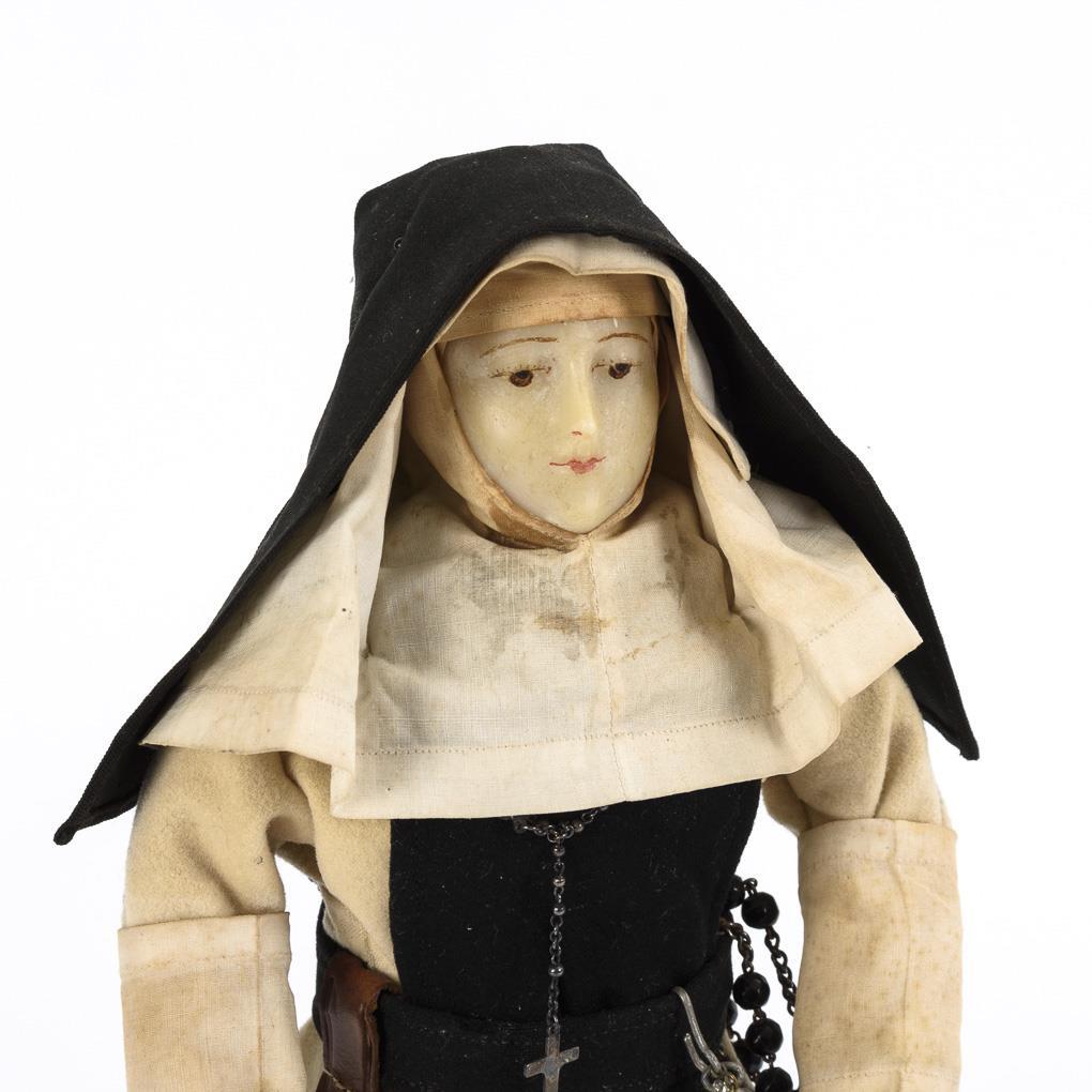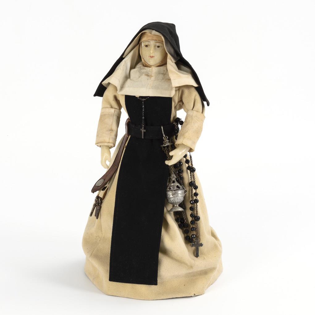 Originalbekleidete Figur mit modelliertem und bemaltem Wachskopf (wohl Brustkopf). Stoffkörper mit Wachsarmen, ohne Beine, auf jünger ergänztem Holzständer. Schwarz-weiße Nonnentracht, dazu Schlüsselbund, Rosenkranz und Weihrauchfass. Altersspuren.