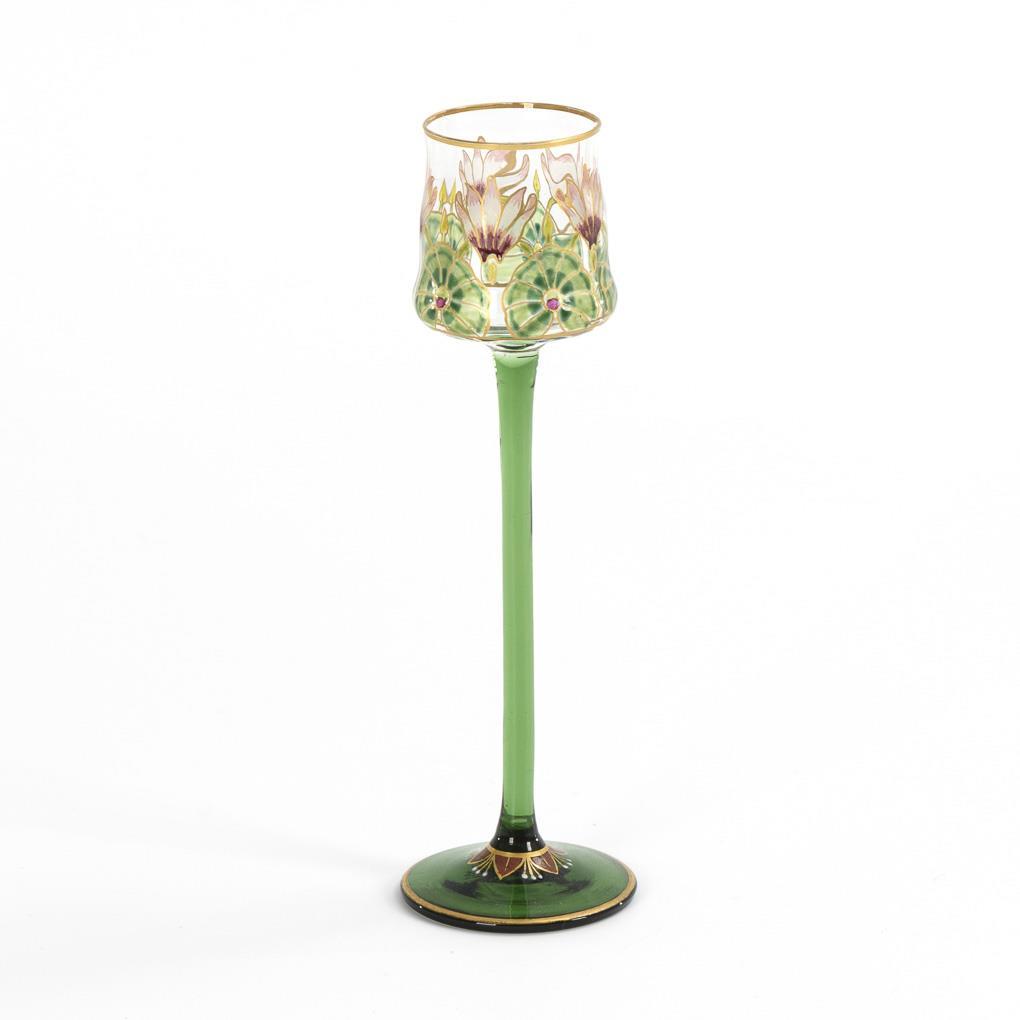 Längsoptisch geblasene Kuppa aus farblosem Glas, Stängel und Rundfuß aus grünem Glas. Umlaufend ein polychrom gemaltes, fünffach rapportierendes Alpenveilchendekor in Tranparent- und Opakemail mit Konturzeichnungen in Gold.