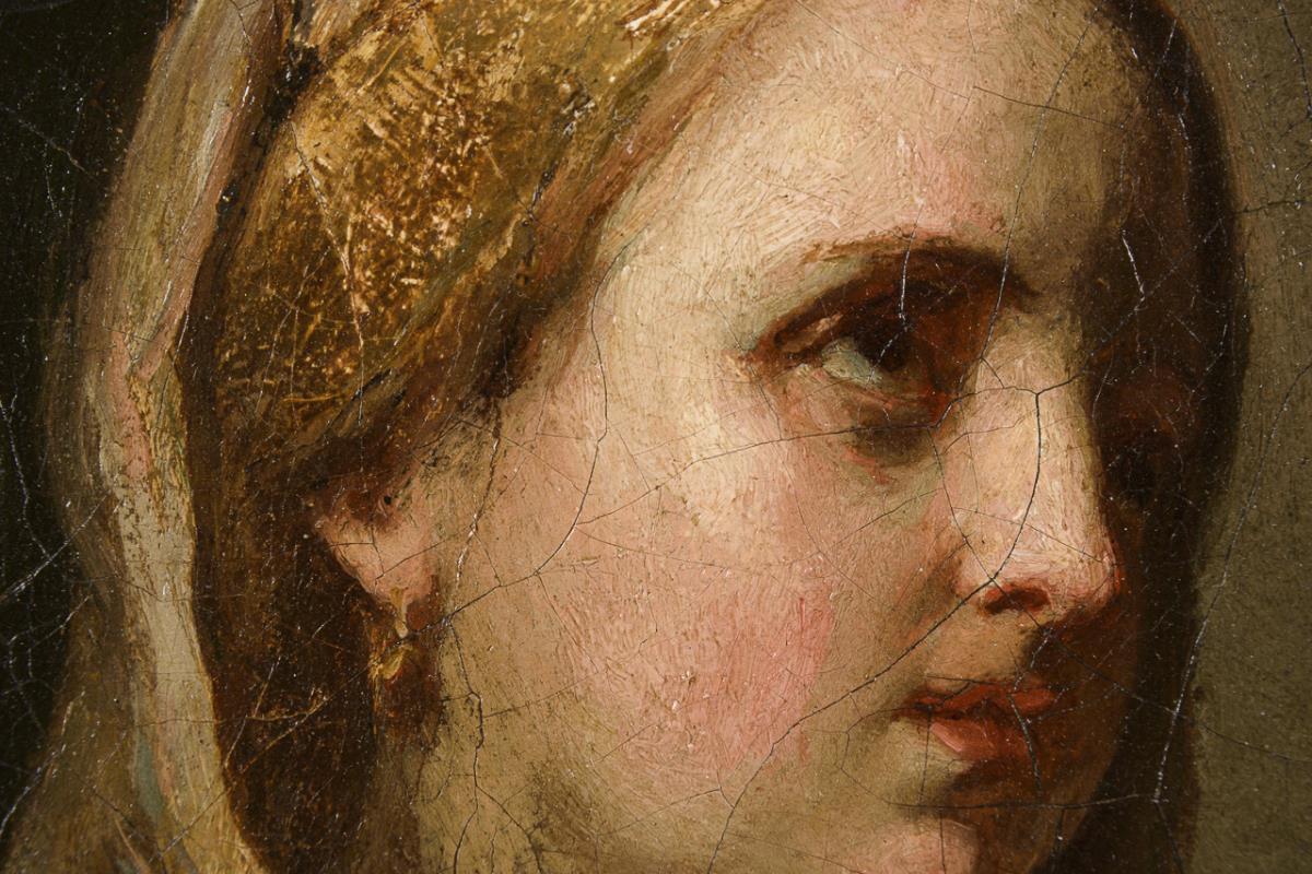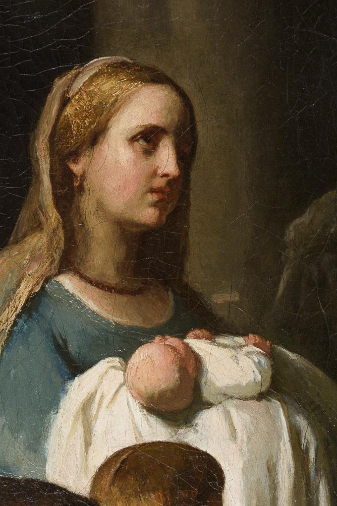 An die Jungfrau Maria erinnernde junge Frau mit Schleier und in hellblauem Kleid mit einem Kind im hellen Licht zwischen betenden Menschen. Altersspuren.
