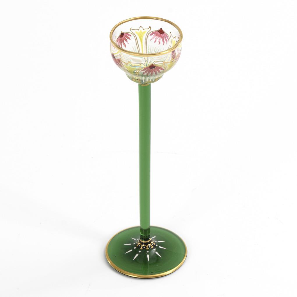 Glockenförmige, längsoptisch geblasene Kuppa aus farblosem Glas, Stängel und Rundfuß aus grünem Glas. Umlaufend ein polychrom gemaltes, stilisiertes und fünffach rapportierendes Floraldekor in Transparentemail mit goldenen Konturzeichnungen und Goldrand.