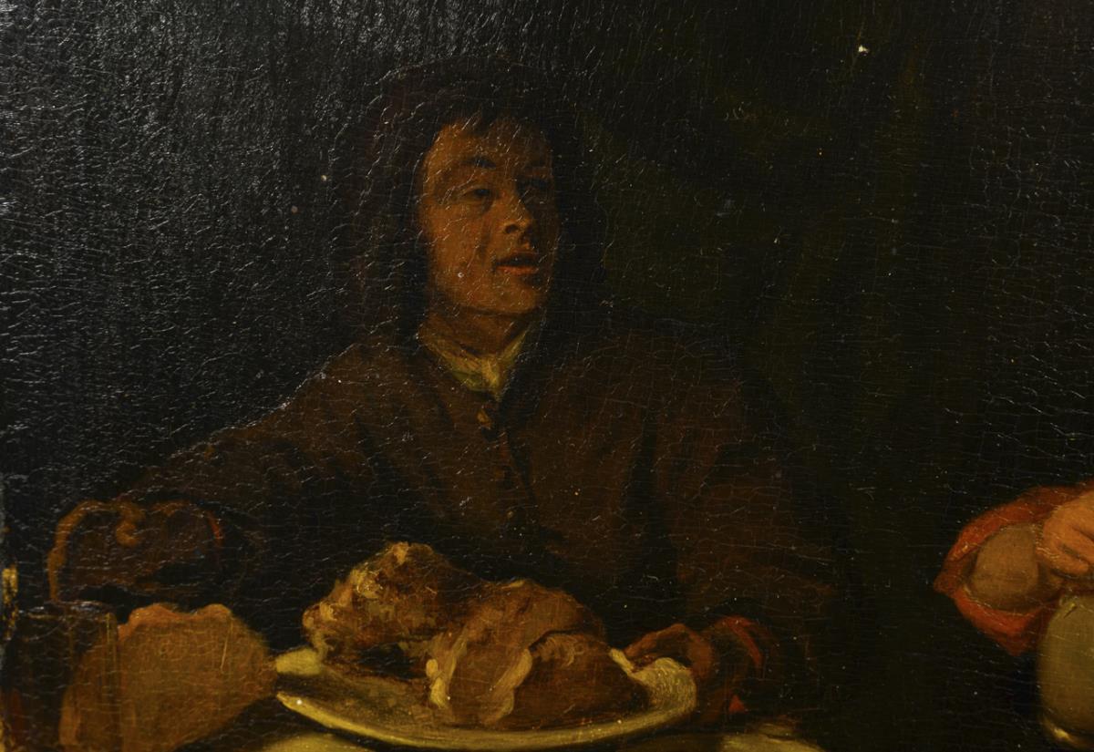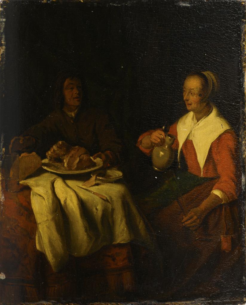 Wohl Kopie nach einem niederländischen Altmeister mit zwei Personen an einem reich gedeckten Tisch beim Essen vor dunklem Vorhang. Altersspuren.