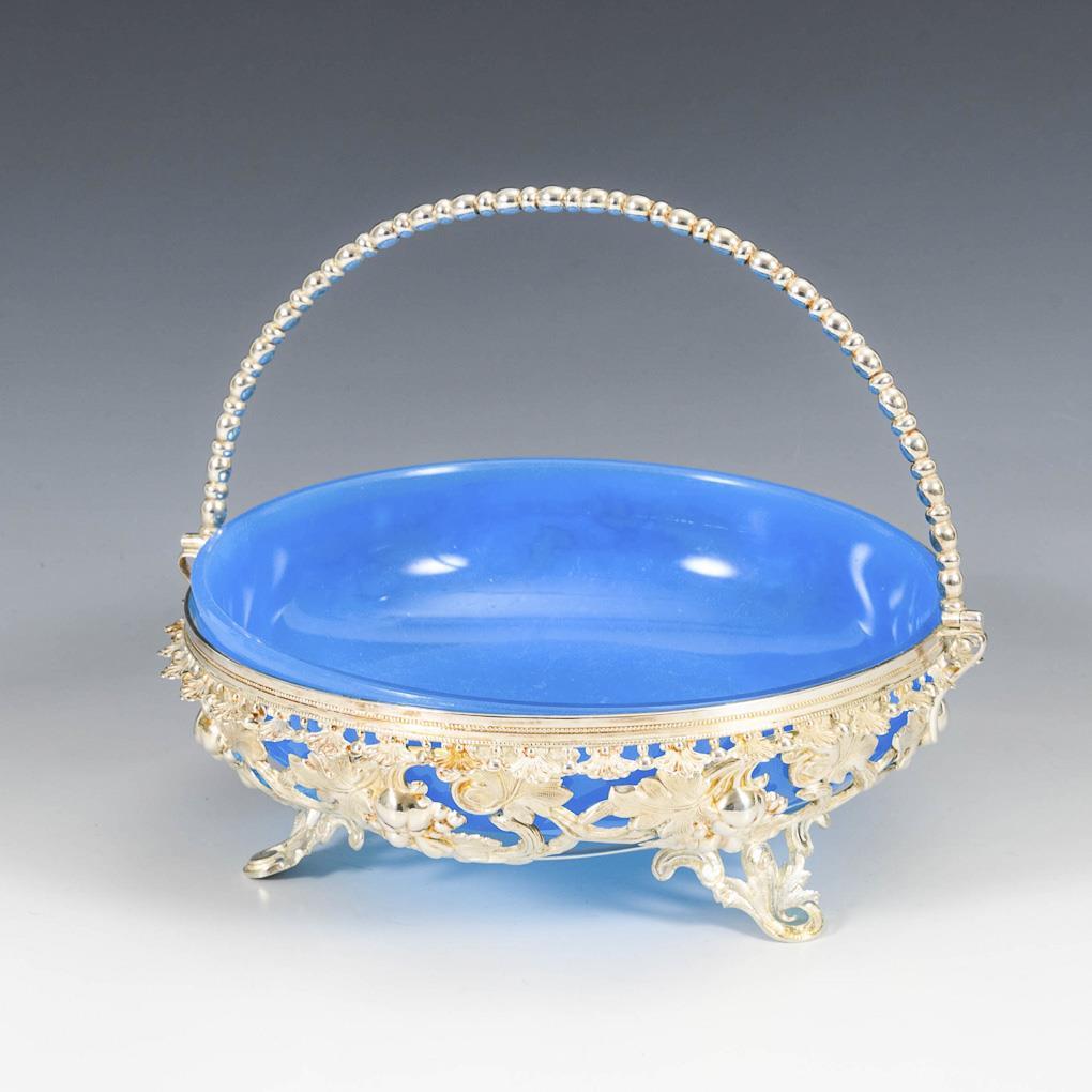 Metall, versilbert. H 7,5 cm (mit Henkel 18 cm), Ø 23,5 cm.