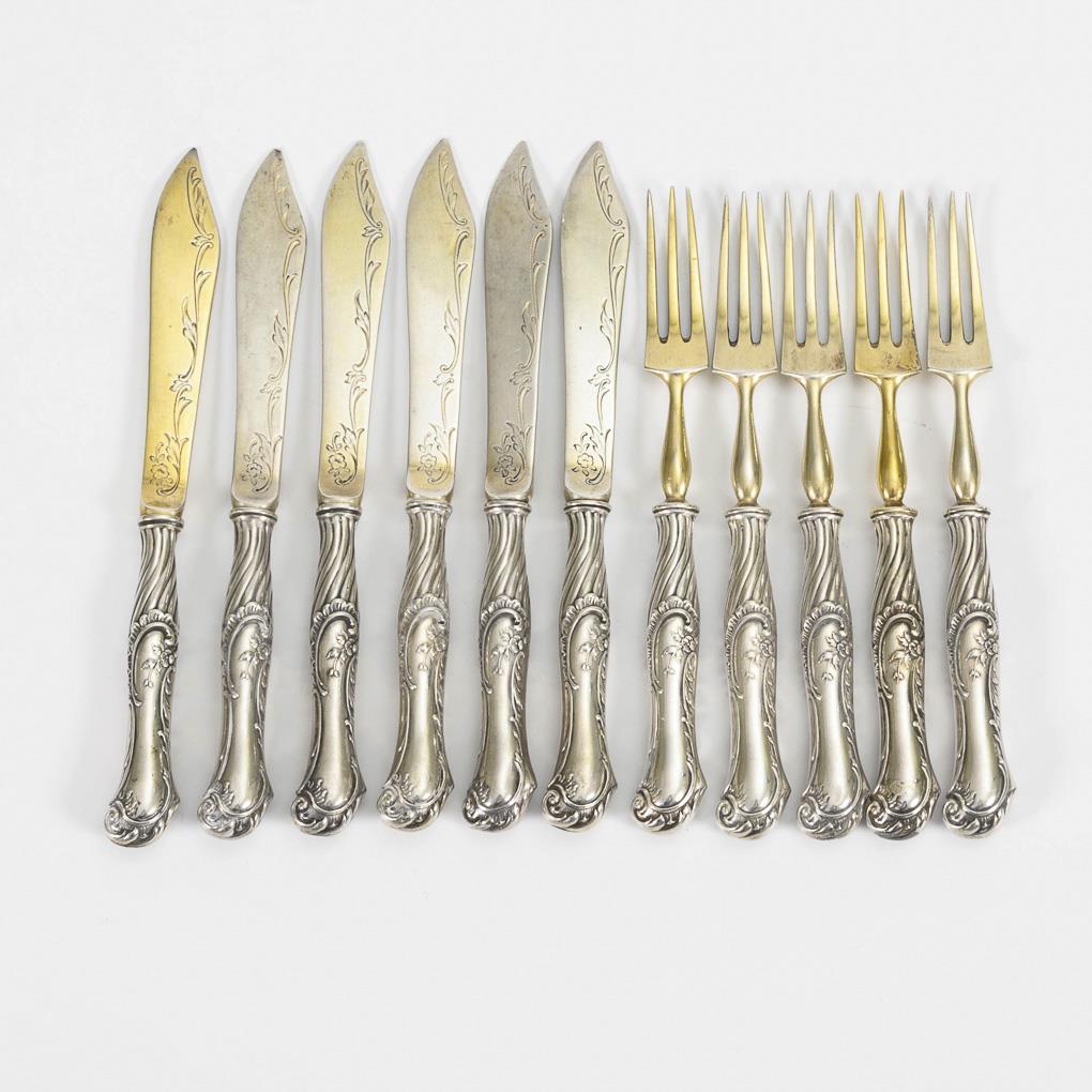 Zierliches 12-teiliges Dessertbesteck mit Rocaillegriffen, Zinken und Klingen vergoldet. Vergoldung etwas berieben.