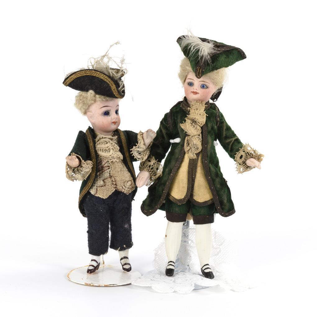 Alle mit Kurbelkopf, Glasaugen, Mohairperücke und modellierten Schuhen. 2x in eleganter Rokokokleidung, 1x mit hohem militärischen Helm. Dazu Windhund mit weißem Echtfell. Kleine Defekte an der Kleidung.