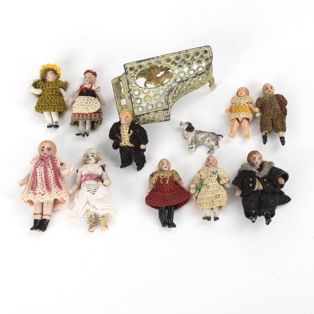10 alt bekleidete Miniaturpüppchen aus Biskuit, meist in gehäkelter Kleidung. Dazu Miniaturflügel und winziges Hündchen aus lackiertem Metall.
