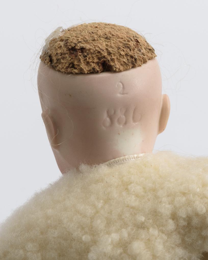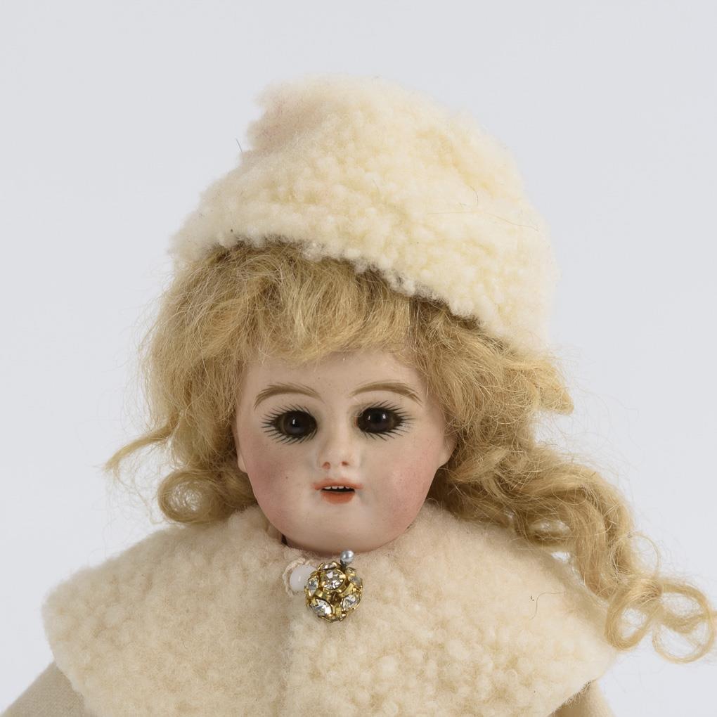 Puppenstubenpuppe als Knabe in höfischer Kleidung und Mädchen mit weißer Winterkleidung, H je ca. 17 cm. Dazu liegender Hund mit echtem Fell, weinrot gepolsterter Stuhl und kleine Zinnkanne mit Glaseinsatz. Kleine Defekte.