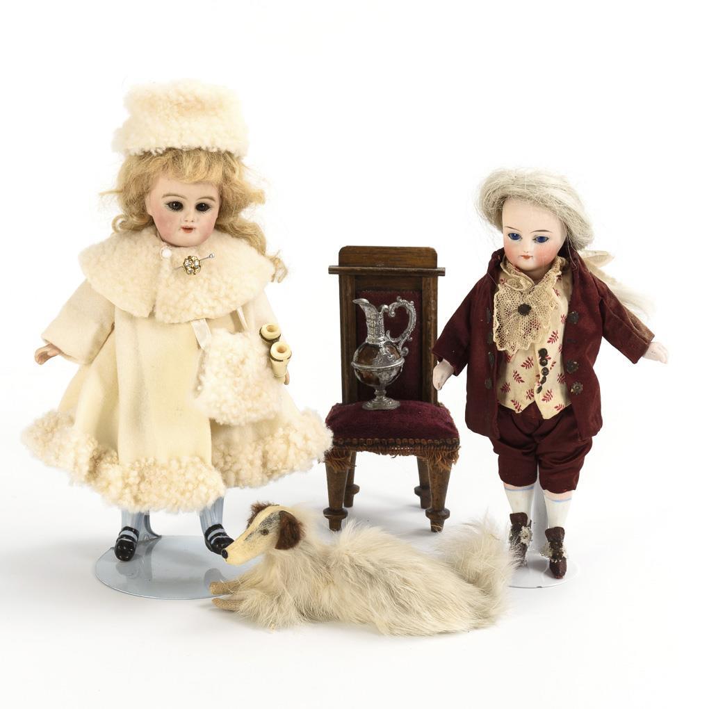 Puppenstubenpuppe als Knabe in höfischer Kleidung und Mädchen mit weißer Winterkleidung, H je ca. 17 cm. Dazu liegender Hund mit echtem Fell, weinrot gepolsterter Stuhl und kleine Zinnkanne mit Glaseinsatz. Kleine Defekte.