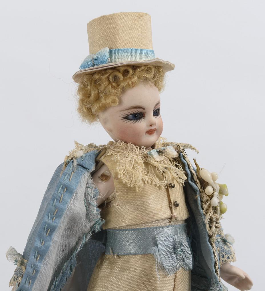 Beide mit Kurbelkopf, blauen Glasaugen und Mohairperücke. Kleiner Herr mit Zylinder und blau-weißem Seidenanzug, blonde Dame in rosa Kleid mit Strohhut.