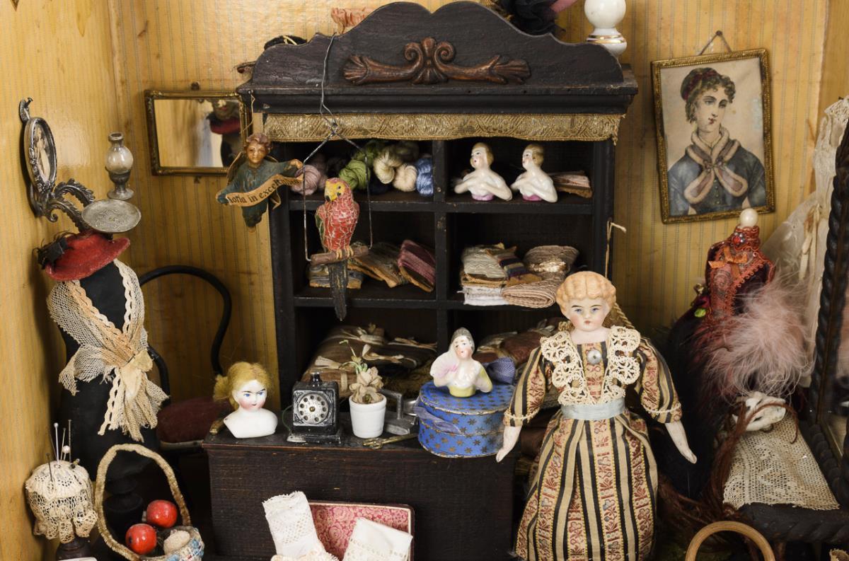 1-Raum-Gehäuse mit offenem Regal, lose eingestellter Theke, Konsolspiegel, 2 Stühlen, 2 Schneiderbüsten und zahlreichen Ausstattungsteilen. Dazu kleine Brustkopfpuppe als Verkäuferin. Altersspuren, kleine Defekte.
