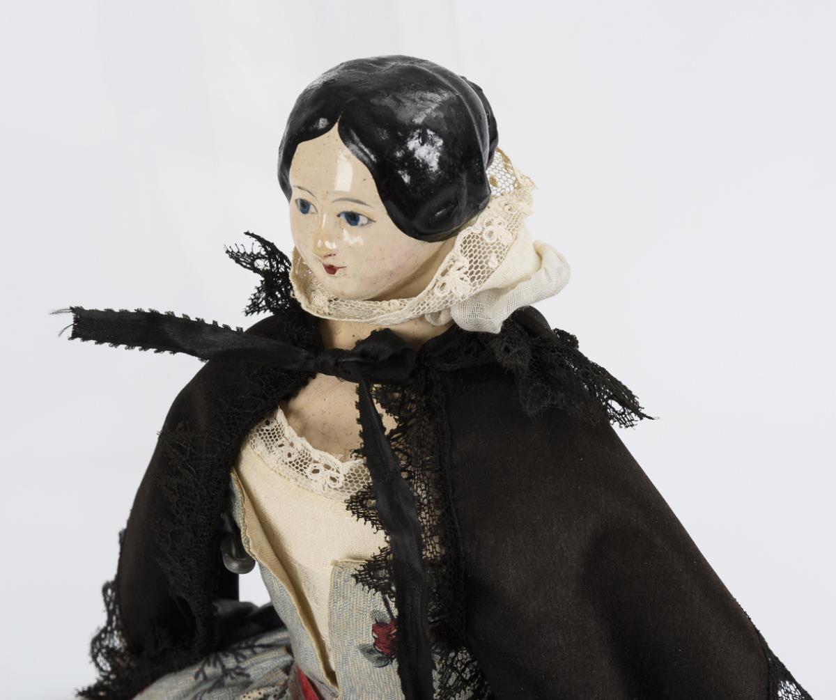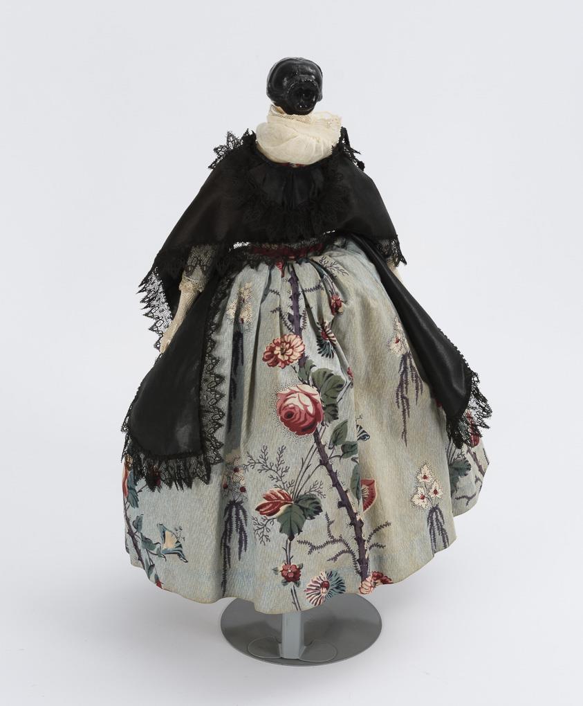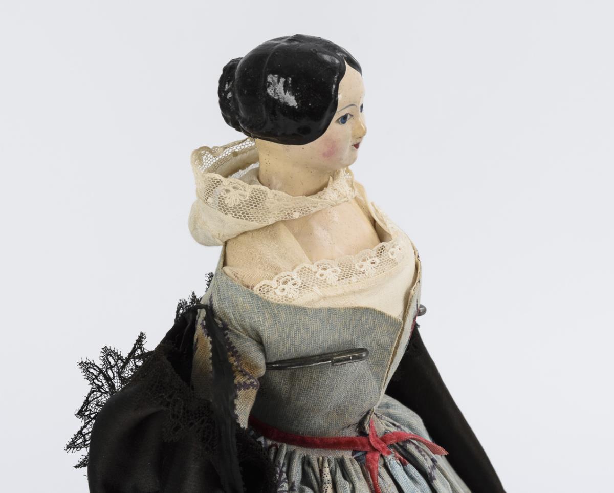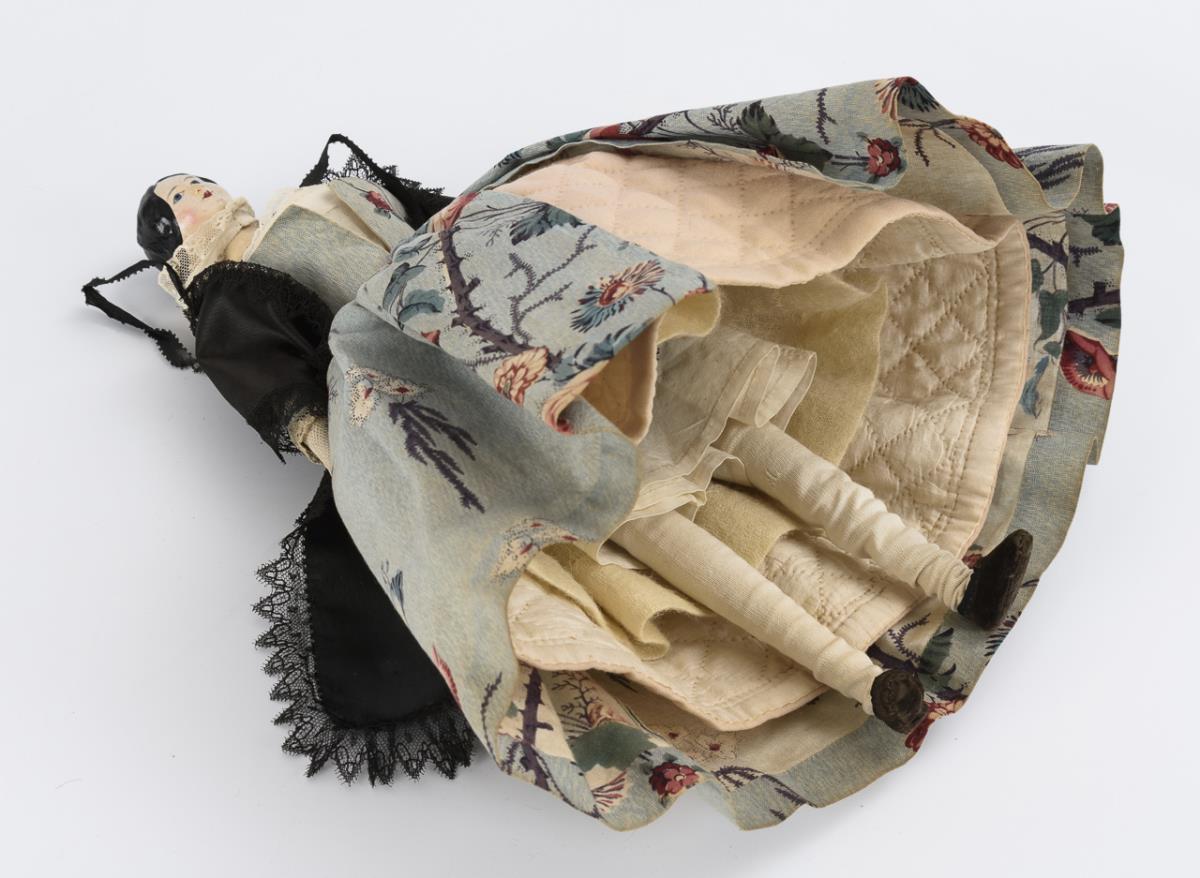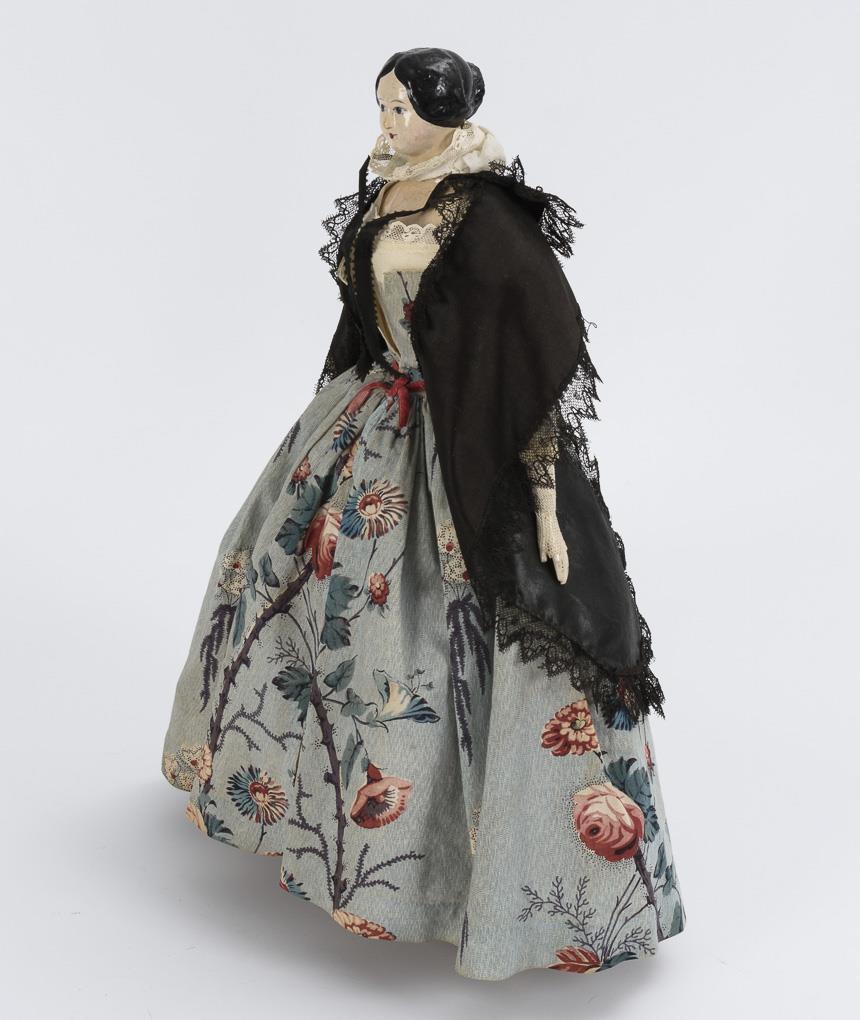 Bemalter Brustkopf aus Papiermaché, blaue Augen, schwarze Haare, Lederkörper, Unterarme und Beine aus Holz. Blaues Mantelkleid mit Blumenmuster. Kopf wohl restauriert, Kleidung erneuert.