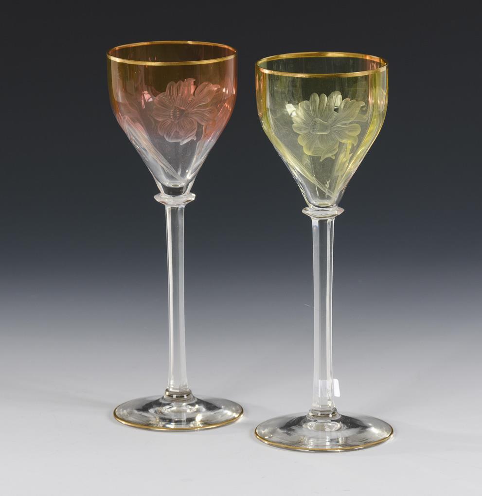 Längsoptisch geblasene Kuppa mit rotem bzw. grünem Verlauf und schauseitig gravierten Narzissen, facettierter Stängel, Rundfuß, Goldstaffage.