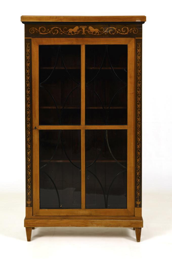1-türiger Salon-Vitrinenschrank im Biedermeier-Stil mit ebonisierter, geometrischer Versprossung und schablonierter vegetabiler Ranken- und Löwenornamentik, auf 4 sich verjüngenden Pfeilerfüßen; innen mahagonifarben gebeizt, 3 Einlegeböden. Alters-/Gebrauchsspuren, Versprossung mit Defekten.