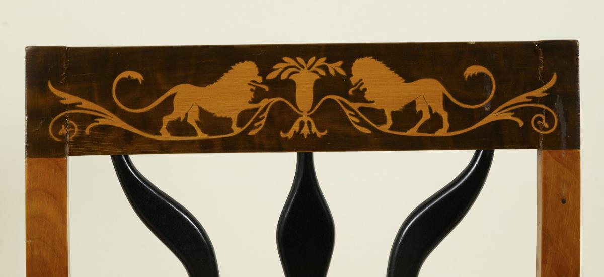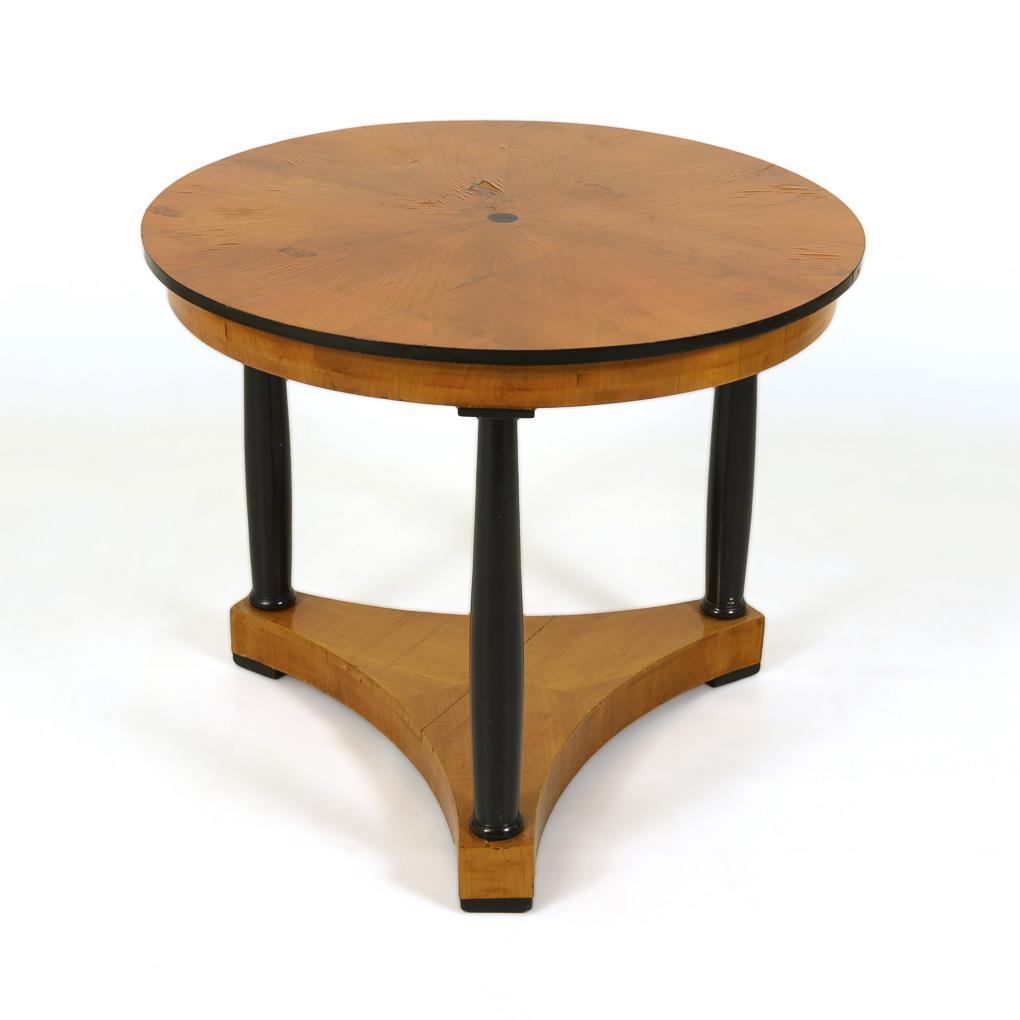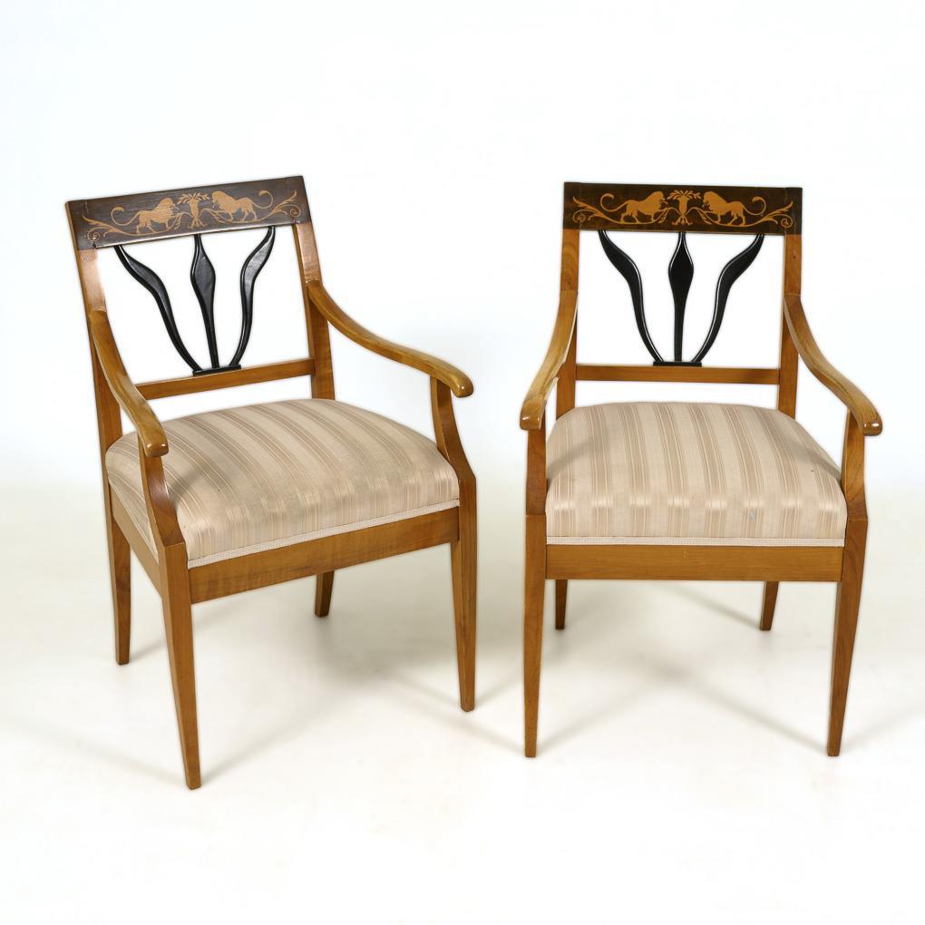 2 gepolsterte Armlehnstühle und 1 runder Salontisch im Biedermeier-Stil, Tisch (H ca. 67 cm, Ø ca. 81,5 cm) mit glatter Zarge und 3 ebonisierten Säulenbeinen und dreipassig eingezogener Bodenplatte; 2 Armlehnstühle mit ebonisierter Schilfblattversprossung und schablonierter Löwenornamentik; champagnerfarben gestreifter Bezug (H je ca. 88 cm, Sitzhöhe je ca. 47 cm). Alters-/Gebrauchsspuren, Furnier der Tischplatte stark rissig und gelöst (Wasserschaden), Bezug fleckig.
