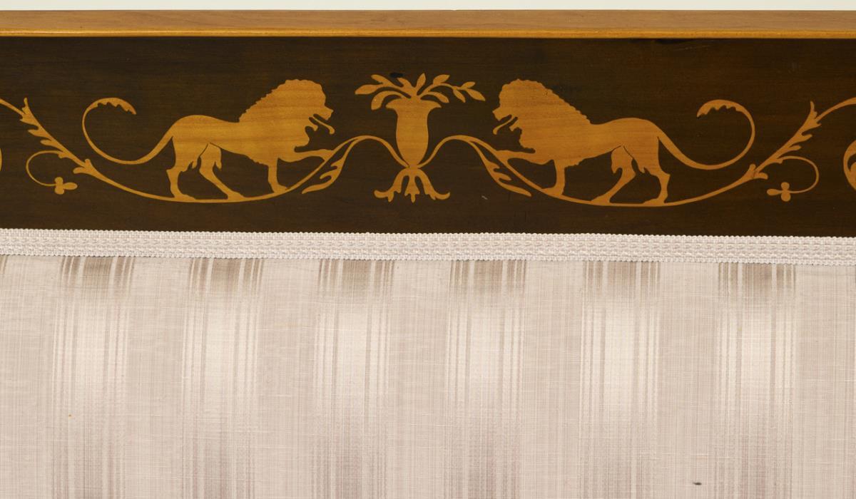 Sofabank im Biedermeier-Stil mit ebonisierter Schilfblattversprossung an den Seiten und schablonierter Löwenornamentik; Rückenlehne und Sitzfläche mit champagnerfarben-gestreiftem Bezug. Leichte Alters-/Gebrauchsspuren, Bezug etwas fleckig.