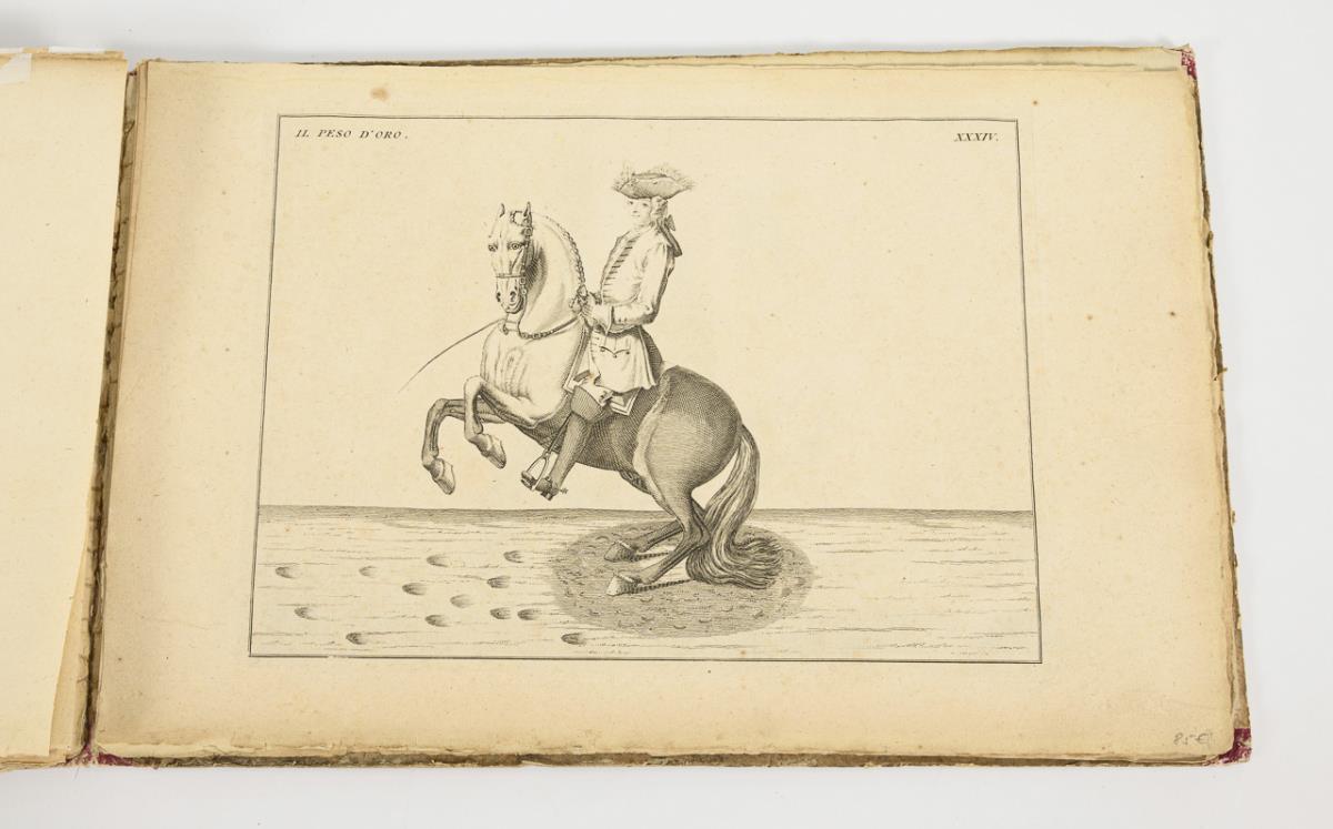 76 Textseiten in französischer Sprache und 18 Kupferstiche mit Darstellung von Reitfiguren. Vorhandene Abbildungstafeln: 2, 11, 12, 16, 17, 19, 23 koloriert, 25, 26, 27, 33, 34, 39, 40, 42, 45, 51, 52. Im Pappeinband. Stärkere Altersspuren, Titelkupfer lose und gelocht, Abbildungstafeln lose.