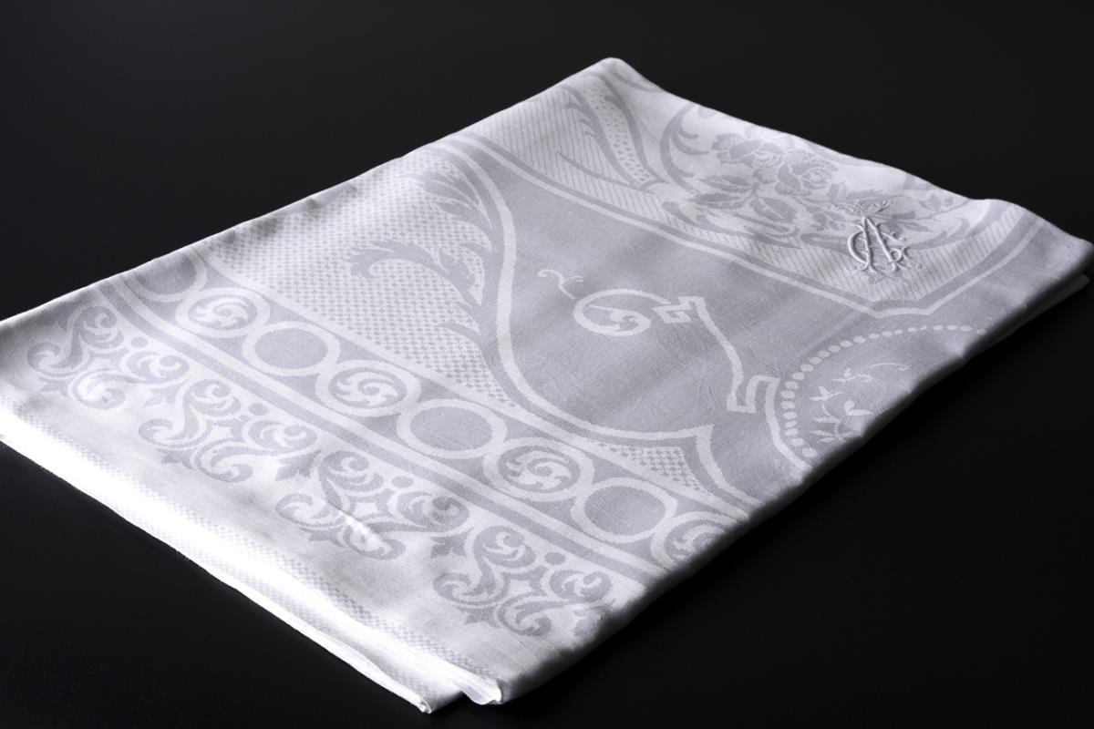 Sehr feiner Leinendamast. 215 x 195 cm.
