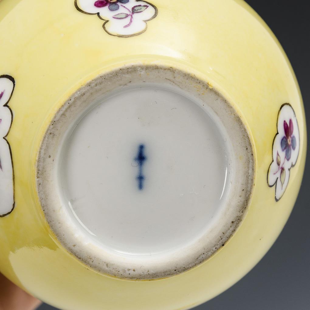 Modell "Glatt" (Kanne). Birnkännchen mit geschwungenem Henkel und ergänztem Blütenknaufdeckel. Zitronengelber Fond mit Blumenmalerei in unregelmäßigen Reserven. Deckel restauriert, minimaler Goldabrieb.
