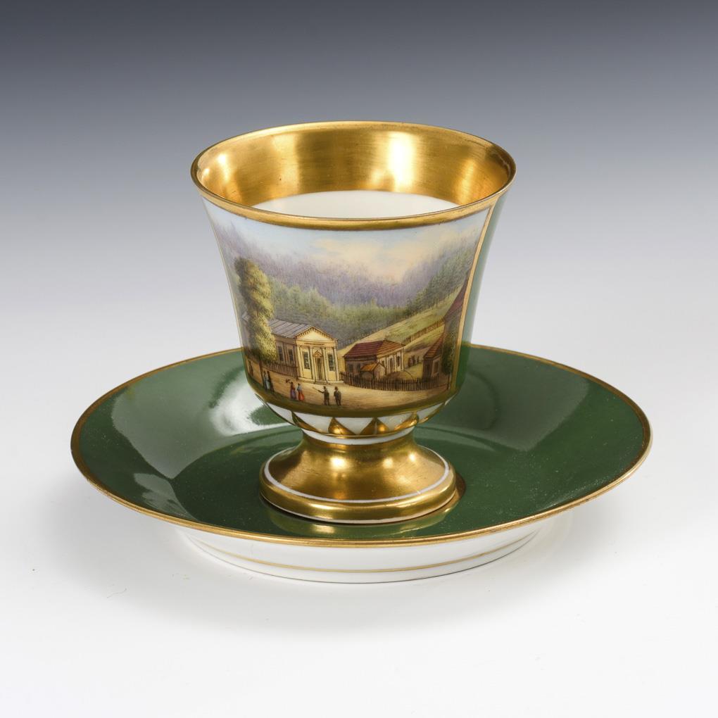 Gefußte Glockentasse mit spitz gewinkeltem Henkel. Grüner Fond, schauseitig eine goldgerahmte Rechteckkartusche mit der unterseitig "Marienquelle" bezeichneten Ansicht eines kleinen Quellhauses mit Personenstaffage.